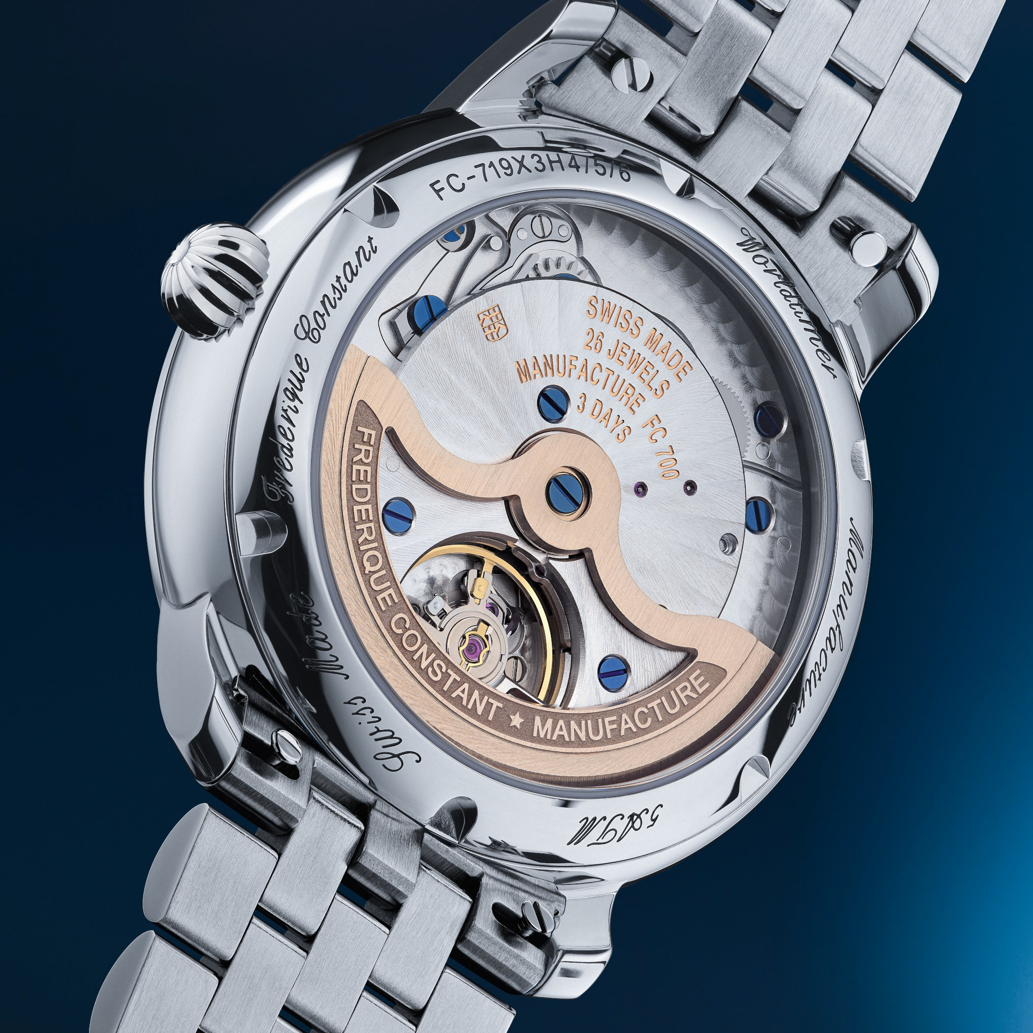 The new Classic Worldtimer Manufacture is powered by the newly developed manufacture calibre FC-719, the brand’s 35th in-house movement since its founding. The new movement, operating at 28,800 vibrations/hour frequency, builds upon the architecture of the previous worldtimer calibre but significantly improves its performance. Most notably, the power reserve has been increased from 38 hours to 72 hours, offering three full days of autonomy. This improvement was achieved through a longer mainspring and revised materials. Despite the larger barrel required for the longer power reserve, the movement fits inside the smaller 40mm case.