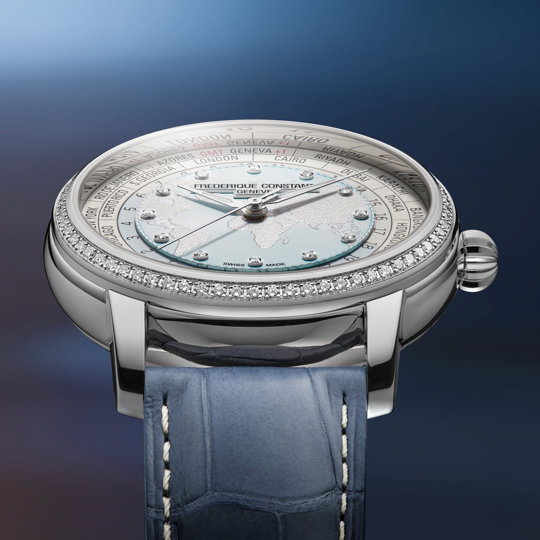 For the non-gem-set references, two dial versions are available at launch. The first retains the brand’s signature look, with navy blue oceans and grey-grained continents, and applied indices filled with Super-LumiNova. This version is presented on a new five-link stainless steel bracelet, with alternating satin-brushed and polished surfaces for a contemporary look. The second version introduces different colourways with gradient blue oceans and taupe continents, contrasted by a white city disc. The layered textures and colour transitions create a more modern appearance. This model is worn on an interchangeable alligator leather strap. A third version, produced in a limited run of 88 pieces, is gem-set with 70 diamonds on the bezel and 12 diamond hour markers. This reference features a light blue dial and is worn on an interchangeable blue leather strap.