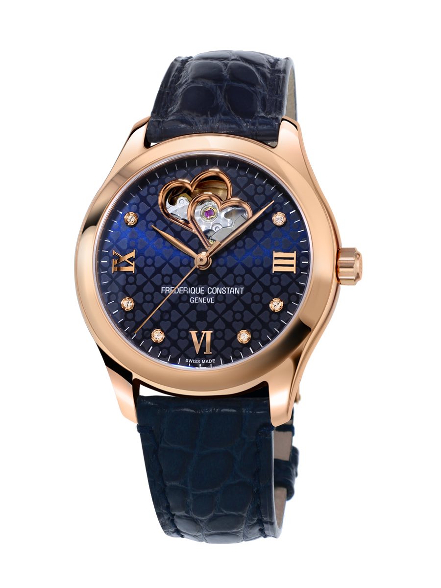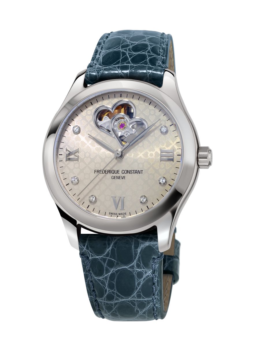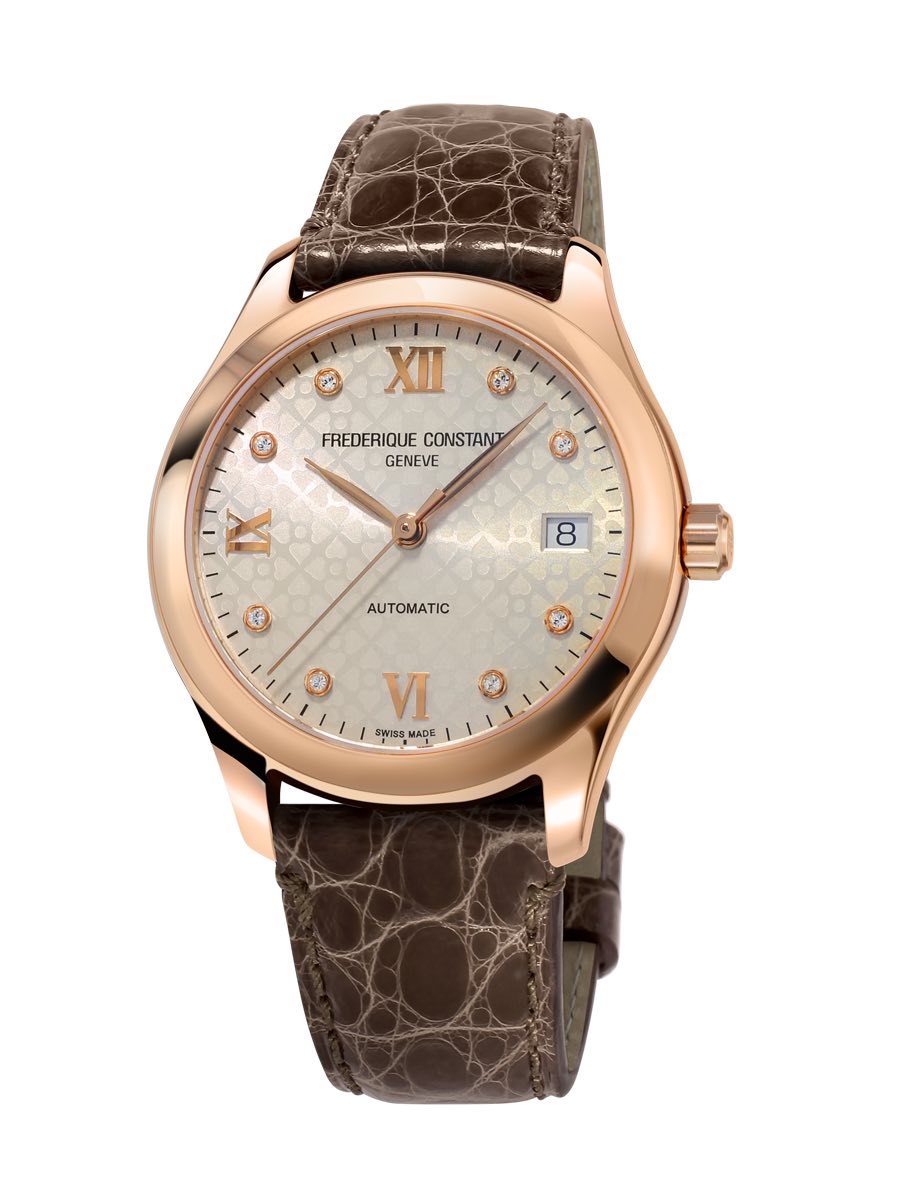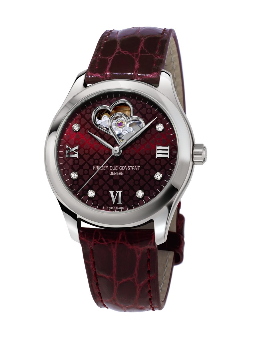 There are two versions of the Ladies Automatics being issued – each in different color renditions. The brand’s iconic Heart Beat is one of the models being offered. It features the signature double open-worked heart motif at 12 o’clock on the sunray dial that allows a view of the movement. Each dial is decorated with a feminine motif that is tone-on-tone for subtle appeal. The Heart Beat watches feature Arabic numerals at 3, 6, and 9 o’clock and six diamond markers. Crafted in 18k rose gold-plated steel or in non-coated stainless steel, the Frederique Constant Heart Beat Ladies Automatics are being offered in four distinct color choices here, including a rose gold-plated model with deep blue dial and strap, a stainless steel version with rich burgundy dial and strap, steel with silvered dial and blue strap, and rose gold with silvered dial and brown strap.