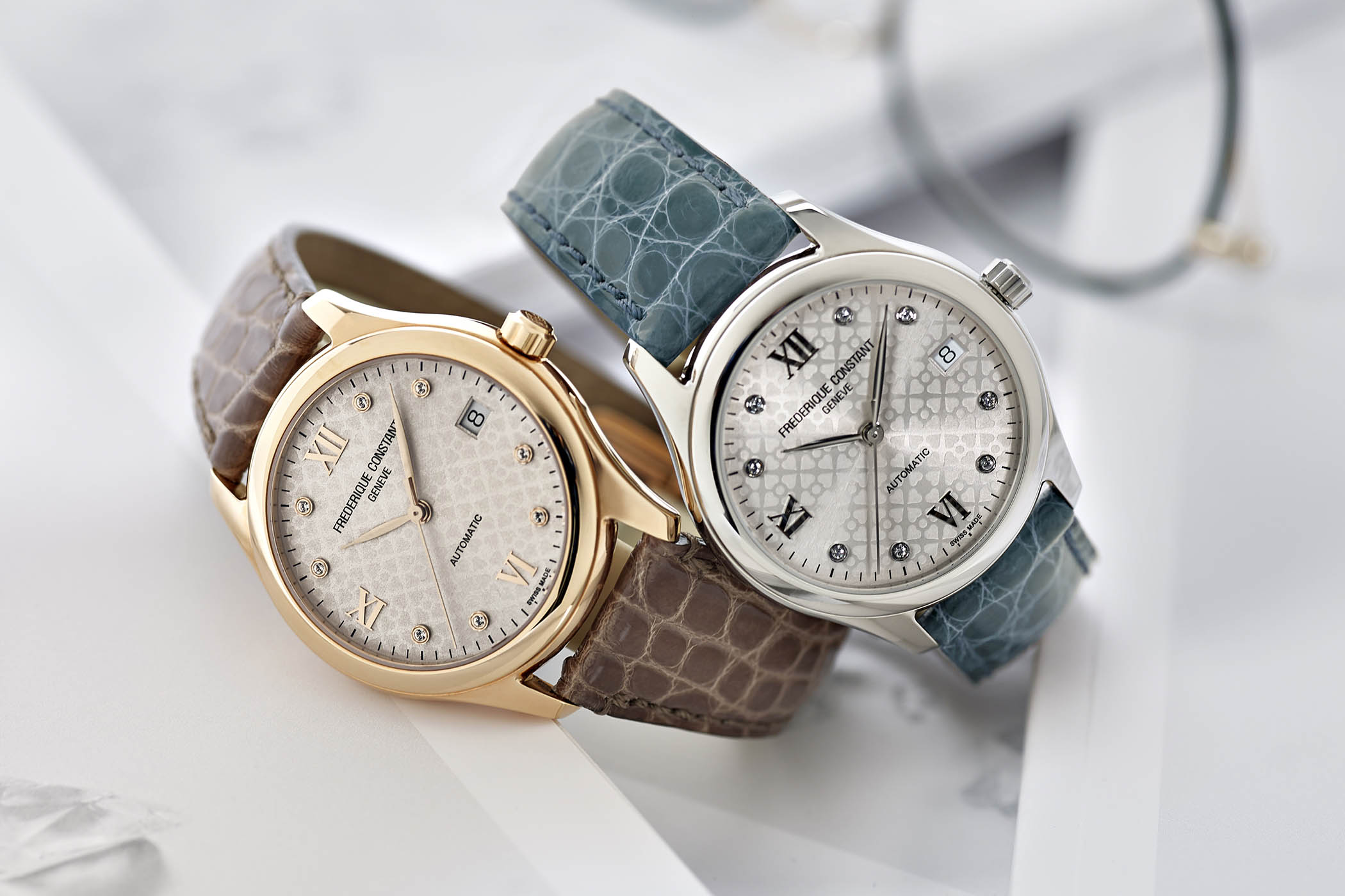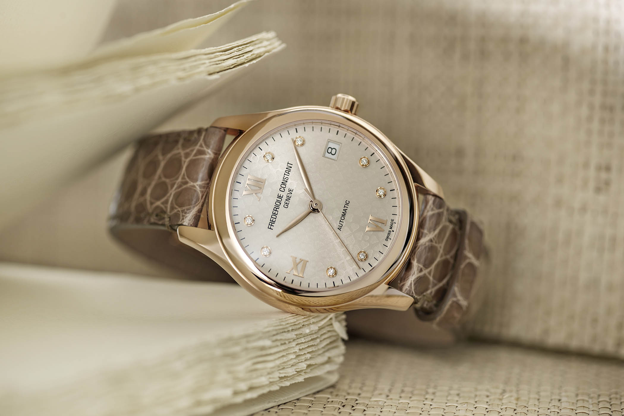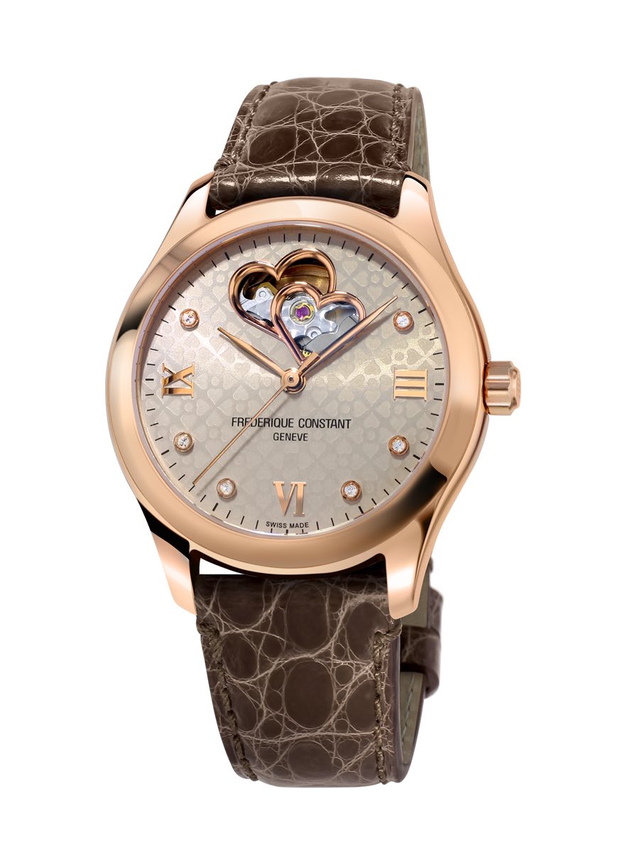 There are two versions of the Ladies Automatics being issued – each in different color renditions. The brand’s iconic Heart Beat is one of the models being offered. It features the signature double open-worked heart motif at 12 o’clock on the sunray dial that allows a view of the movement. Each dial is decorated with a feminine motif that is tone-on-tone for subtle appeal. The Heart Beat watches feature Arabic numerals at 3, 6, and 9 o’clock and six diamond markers. Crafted in 18k rose gold-plated steel or in non-coated stainless steel, the Frederique Constant Heart Beat Ladies Automatics are being offered in four distinct color choices here, including a rose gold-plated model with deep blue dial and strap, a stainless steel version with rich burgundy dial and strap, steel with silvered dial and blue strap, and rose gold with silvered dial and brown strap.