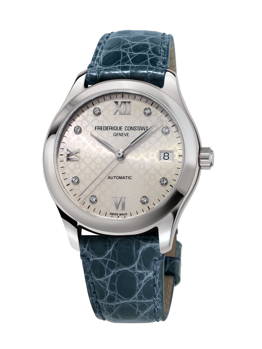 There is also a full-dial version of the Ladies Automatic collection. Without the double overlapping heart motif at 12 o’clock, this version features eight diamond markers on the dial, along with Roman numerals at 12, 6 and 9 o’clock. There is a date aperture at 3 o’clock on this version. Here again, the watch is offered in 18k rose gold-plated steel or in stainless steel. The color motifs here include a pale grey/blue strap version in stainless steel with silver dial and a rose gold-plated version with silvered dial and brown alligator strap.