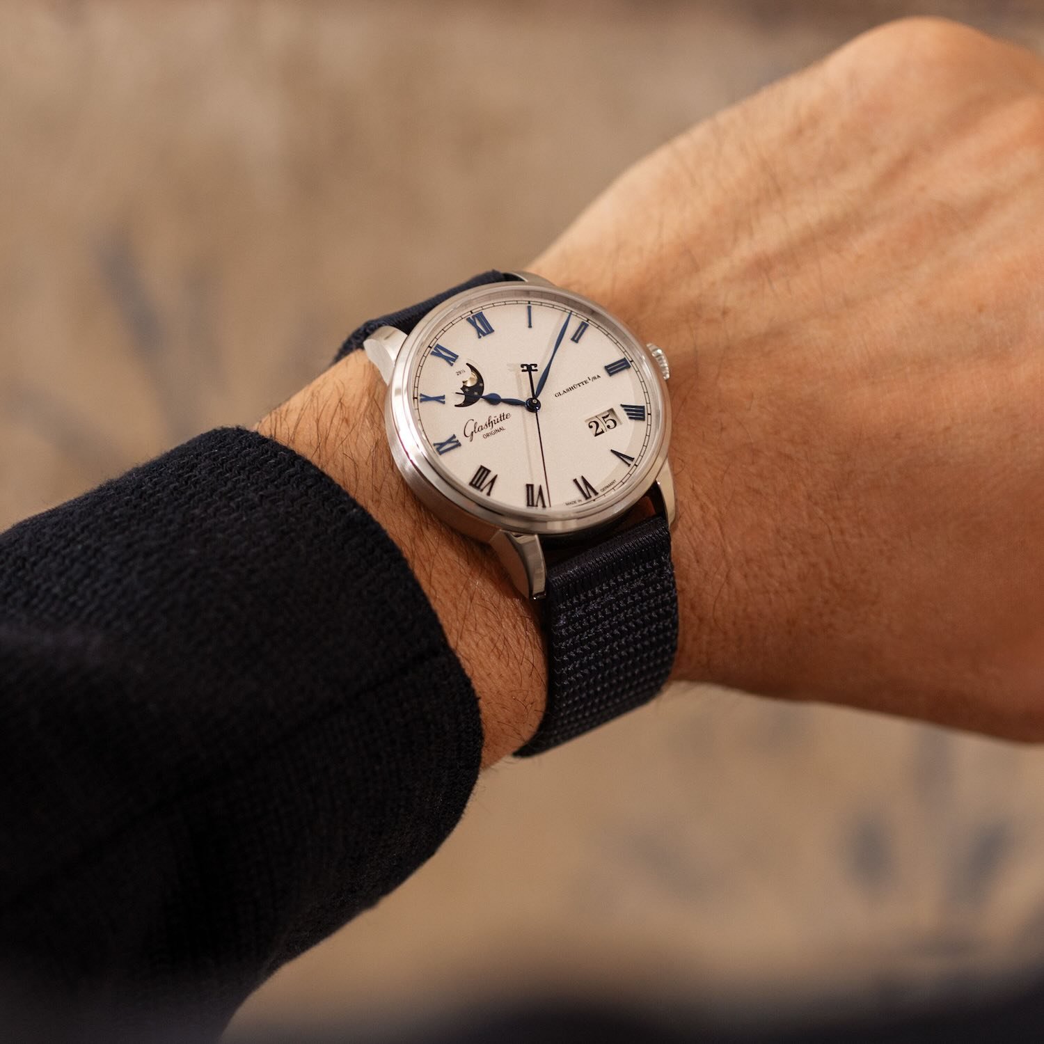 Powered by the Glashütte Original automatic calibre 36-24, it has a remarkable power reserve of at least 100 hours and an anti-magnetic silicon balance spring that guarantees precision and reliability. When correctly set and kept wound, the moon phase indicator can run for 122 years without correction.