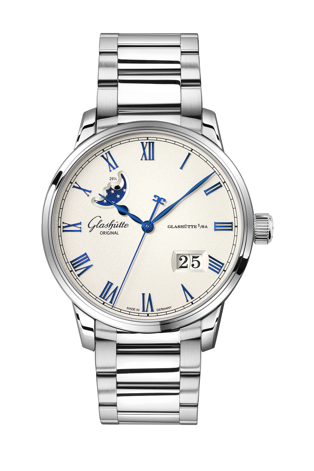 The refreshed dials of the new Panorama Date Moon Phase models are similar to a couple of stainless steel Senator Excellence models with textured galvanic grey dials. Available in frosted silver or frosted copper, the fine-grained surface provides a more modern matte background for the slim Roman numerals. Applied by hand and made of solid gold, the Roman numerals are coated in a rich blue colour matching the traditional railway-style minutes track, the hands and the sky in the moon phase aperture. The blued pear-shaped hands and slim central seconds hand with a double-G symbol underscore the classical mood of the watch.