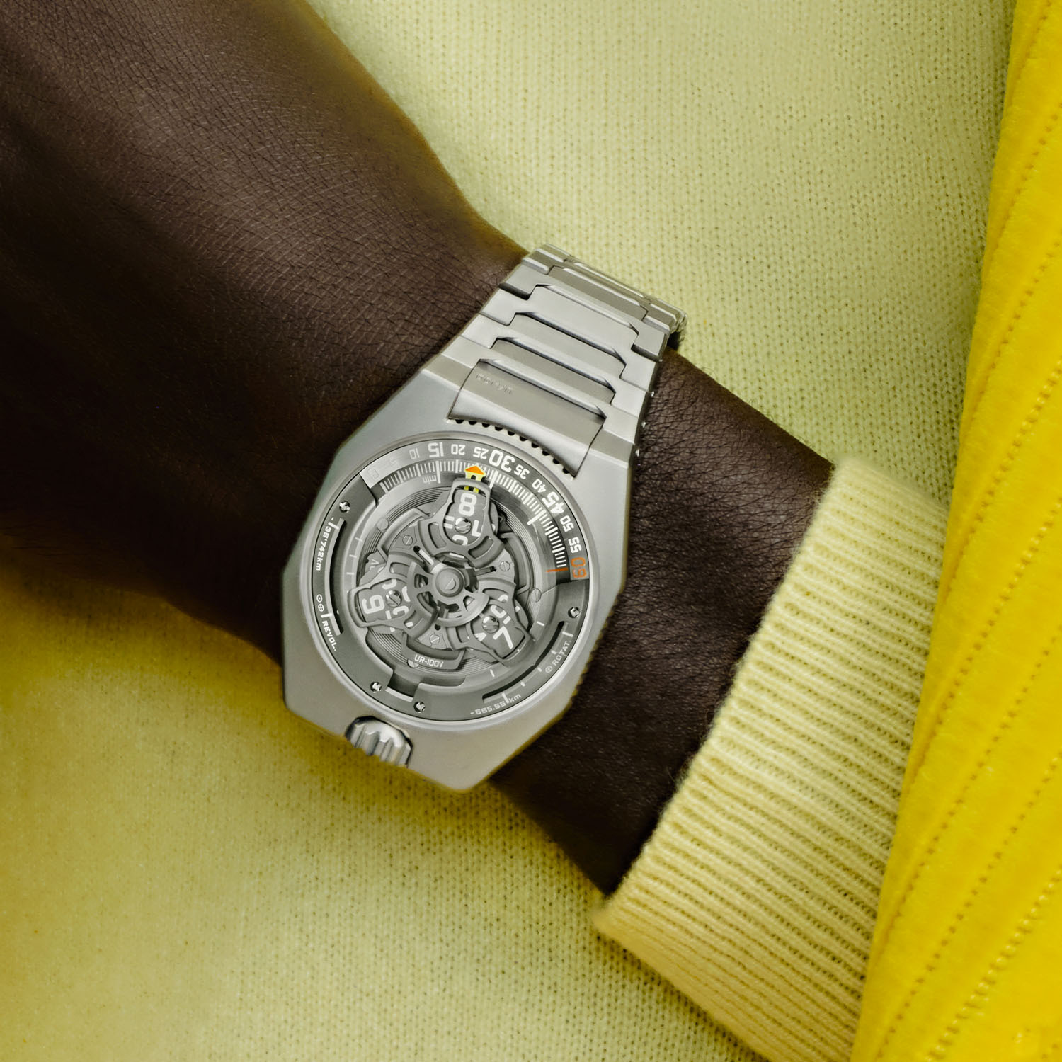 If you look at the collection of watches offered by independent watchmaker URWERK, there are certainly some bold and visually striking watches. Colourful accents, sci-fi-inspired cases, and displays unique to the watchmaking world. But the brand has also demonstrated more than once – specifically with its UR-100 collection – its ability to play on the monochromatic and neutral tones of raw materials. This watch has already been offered in several tone-on-tone editions, either carbon, black titanium or raw titanium. The new edition, dubbed UR-100V Magic T, feels familiar at first sight, but it’s a fresh take on the grey tones of titanium.