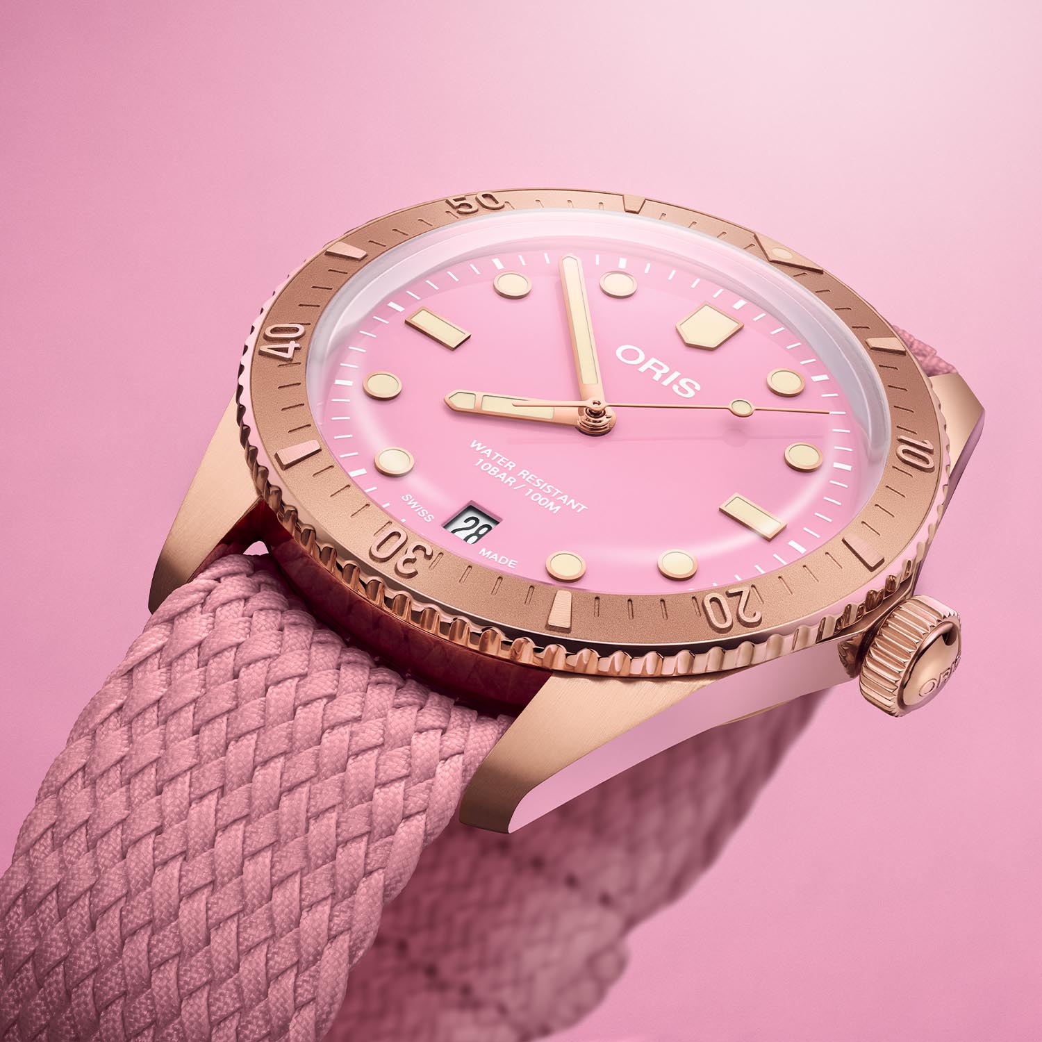 When they were released last year, in the midst of the pandemic, the Oris Divers ve Cotton Candy watches not only came as a surprise, but they also brought a spirit of lightheartedness and fun colours to people yearning to see the end of the pandemic. The timing was just right, and these unconventional pink, light blue and green bronze models became surprisingly successful. This year, the Ho?lstein-based brand expands the Cotton Candy collection with an even more relaxed style by adding Perlon straps to the portfolio.