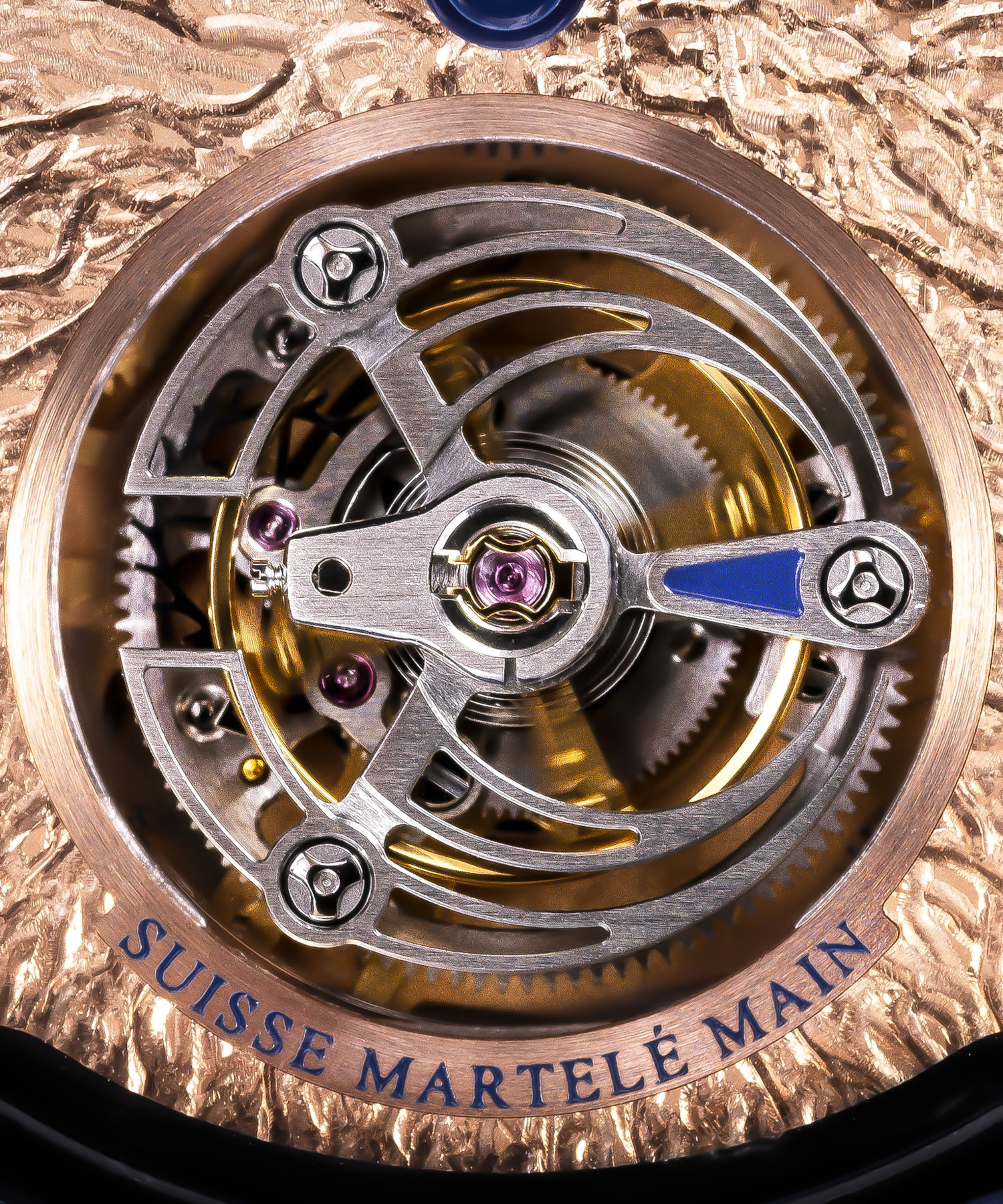 The uncoated 18K rose-gold dial features a hand-hammered texture, a meticulous craft that requires significant experience and time to achieve a uniform and refined finish, making each dial unique. Applied Roman numerals at the 3, 9, and 12 o’clock positions lend the model its name. The central hour and minutes baton-shaped hands are filled with white Super-LumiNova and outlined in blue, matching the design of the indices. A plaque with the brand name adorns the upper half of the dial, while the aperture at 6 o’clock showcases the tourbillon with its titanium cage, designed to represent the Gerald Charles logo. The blue element of the tourbillon doubles as a seconds hand, adding a functional and aesthetic touch.