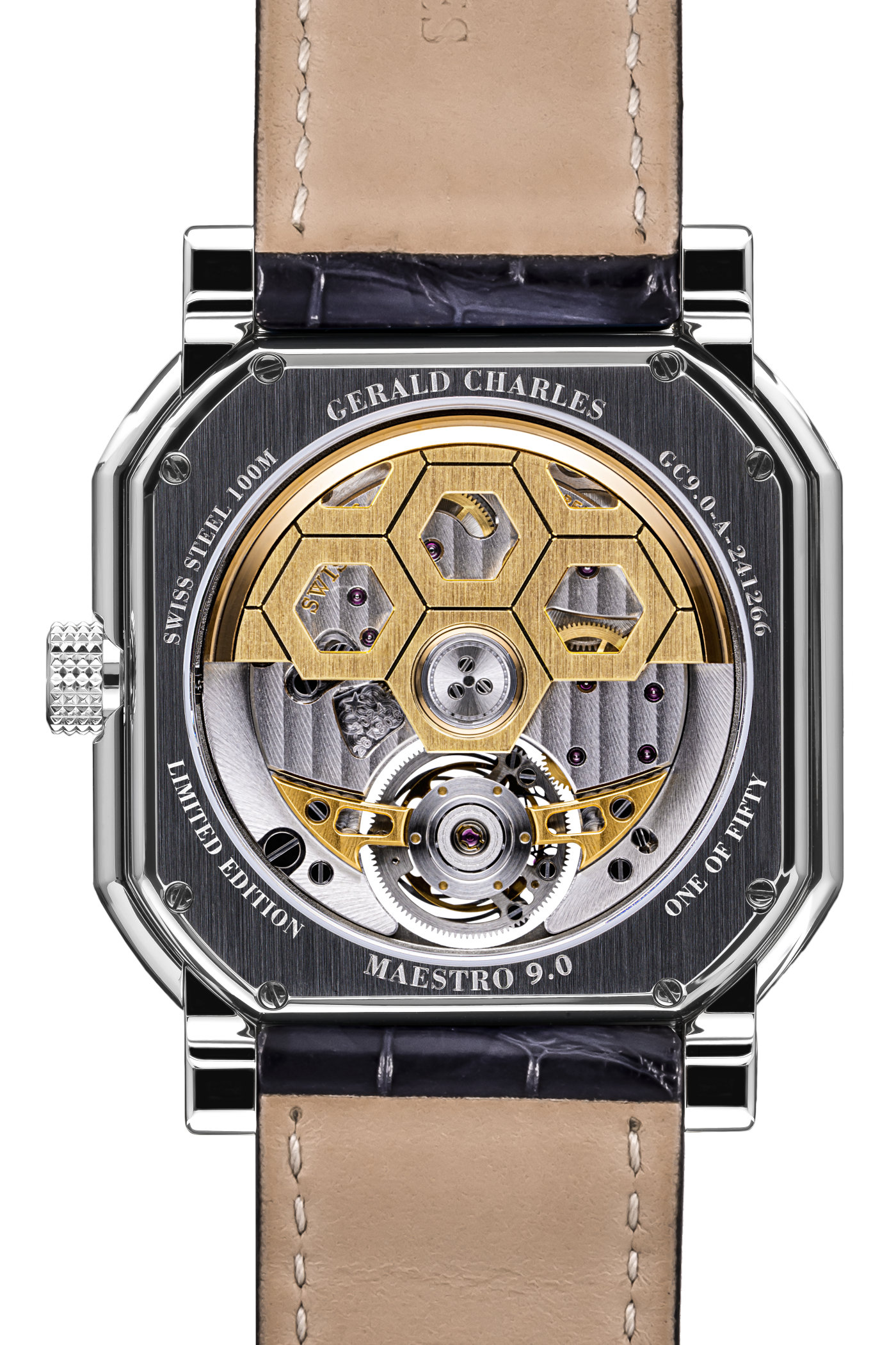 The Gerald CharlesMaestro 9.0 Roman Tourbillon is worn on the hand-stitched blue alligator strap with a newly designed folding clasp for secure closure. It is offered as a limited edition of 50, and the price is CHF 82,400 or EUR 83,100 (VAT excluded).