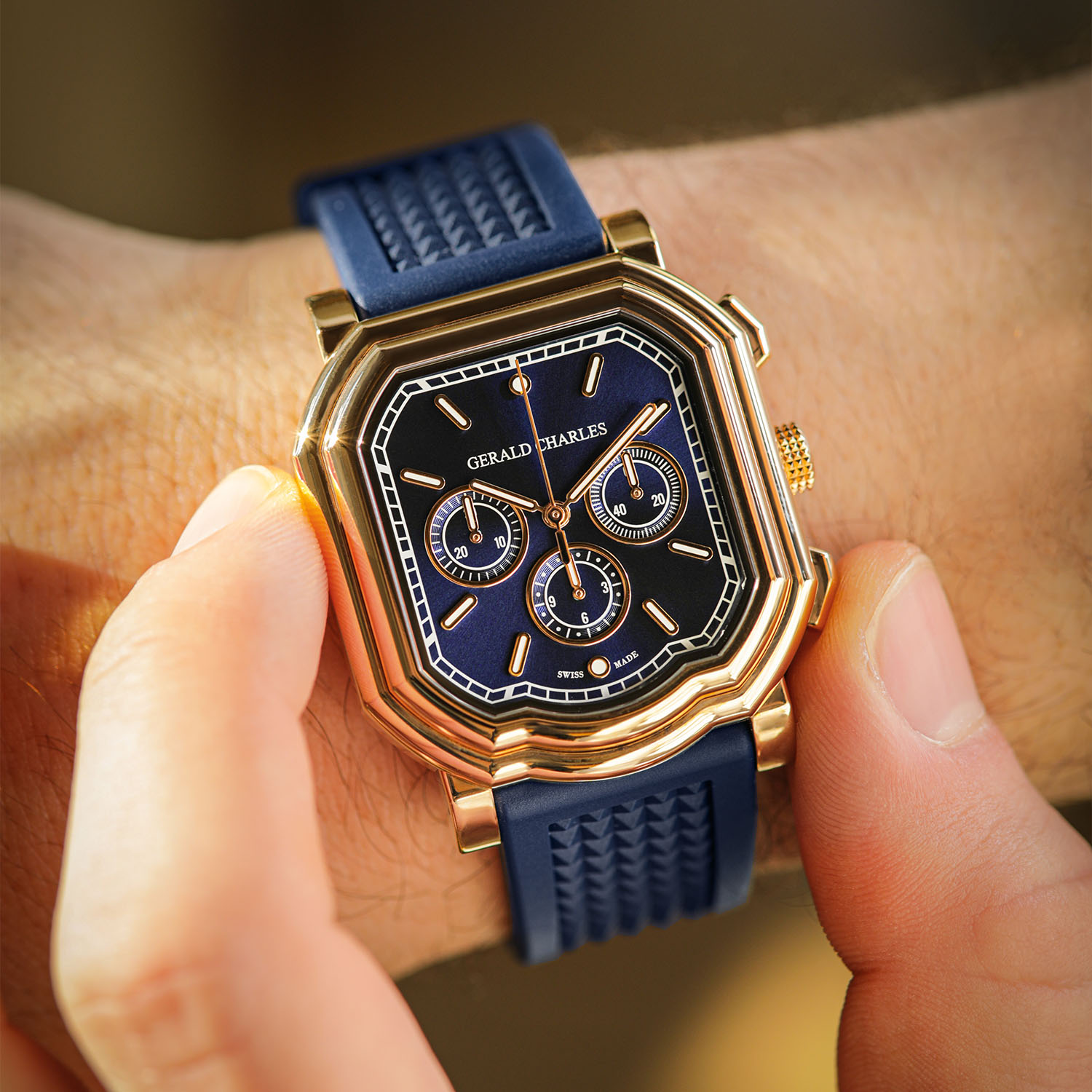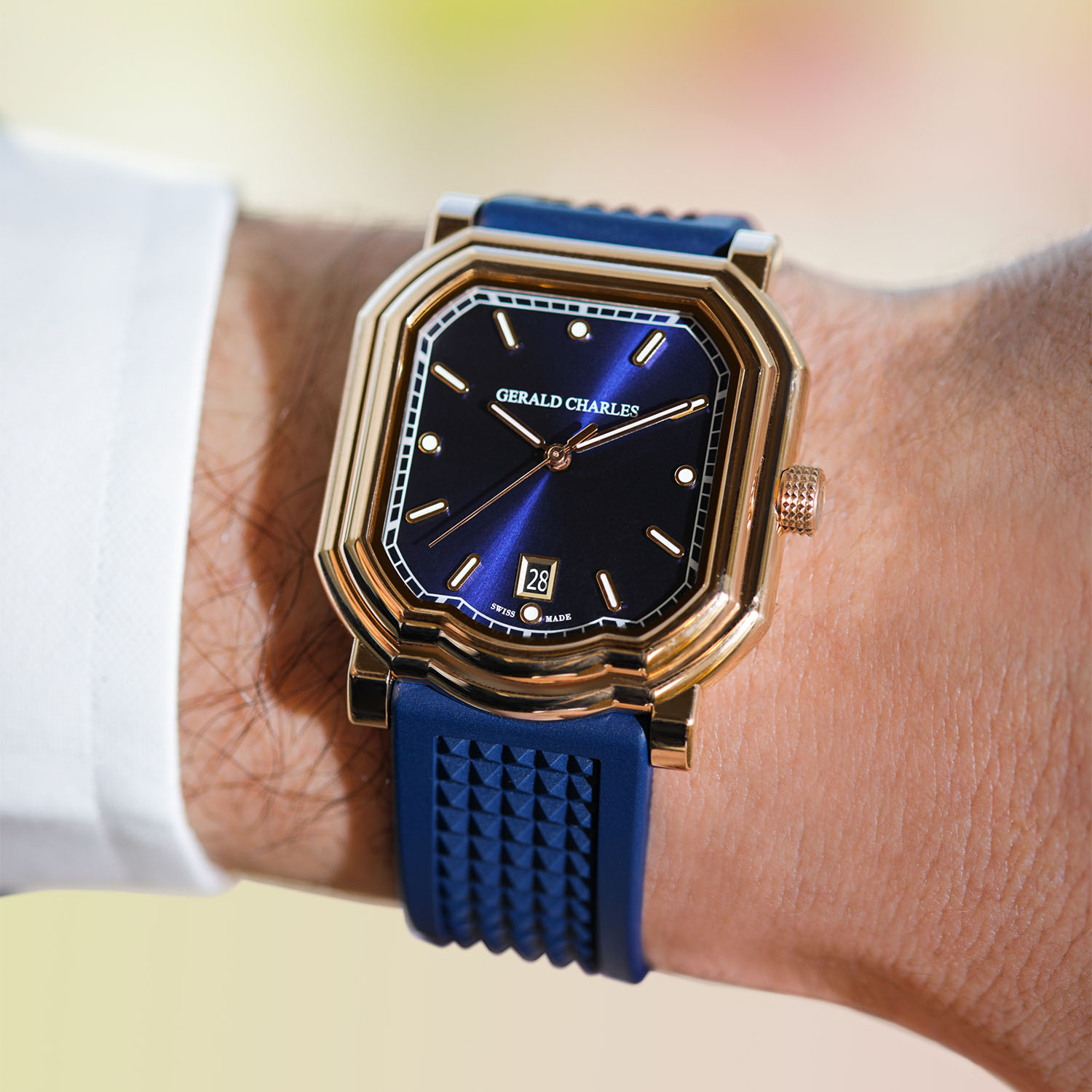 It takes a lot of pluck to establish a watch brand on one design alone. There again, if the design is by Gerald Genta, one of the most acclaimed and prolific watch designers of our time, things are a little different. Just think about Audemars Piguet’s success riding on the back of Genta’s indestructible 1972 design for the Royal Oak or Patek Philippe’s successful run with the Nautilus. Gerald Charles, the brand founded by the late Gerald Genta in 2000, revolves exclusively around the Maestro, a flamboyant case design that returns today in two ultra-thin rose gold models with royal blue sunburst dials and a matching rubber strap. Another novelty is the incorporation of the hexagonal-shaped oscillating weight first appearing on the Maestro 8.0 Squelette, a feature that will be integrated into all new Gerald Charles watches.