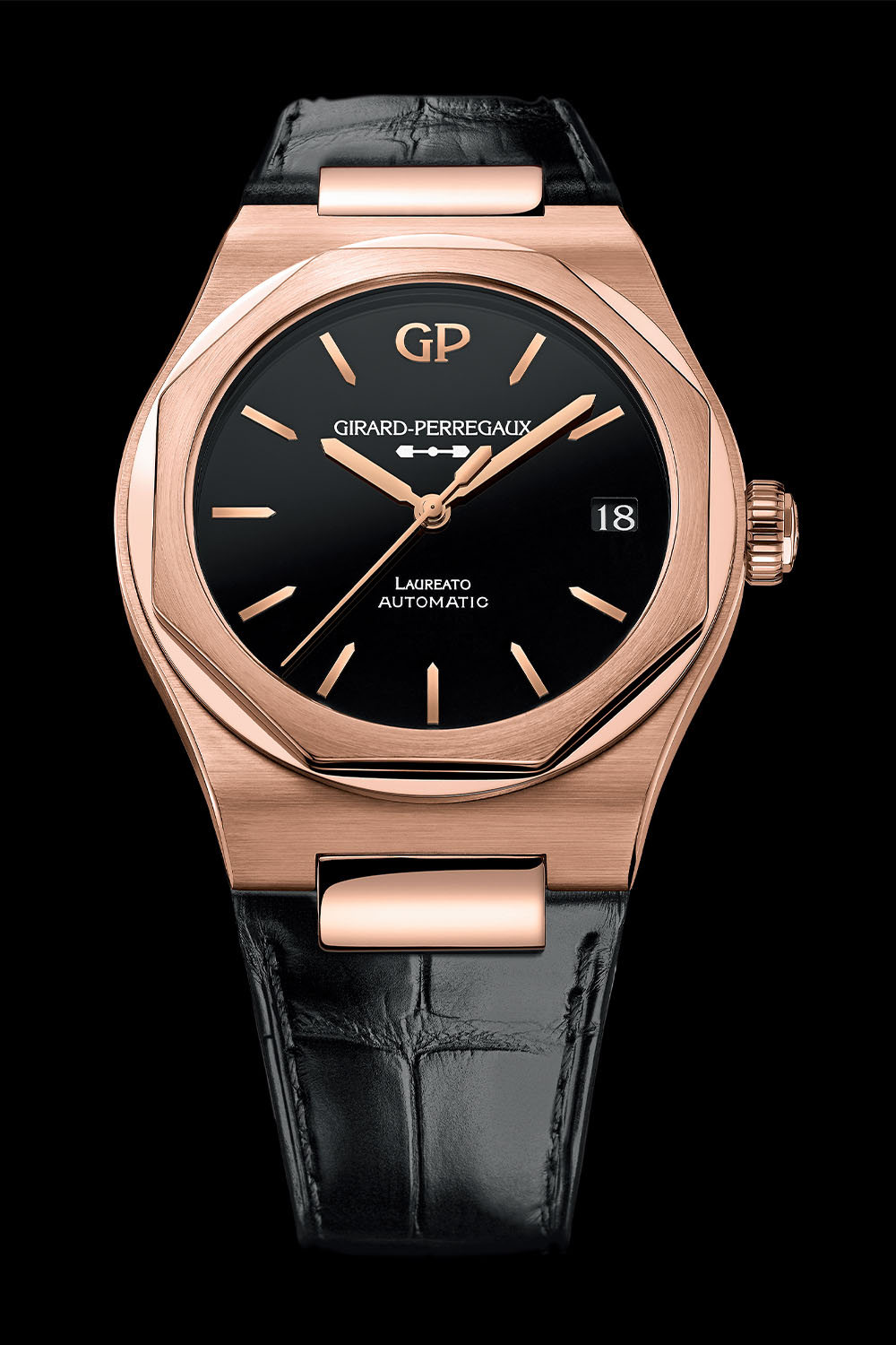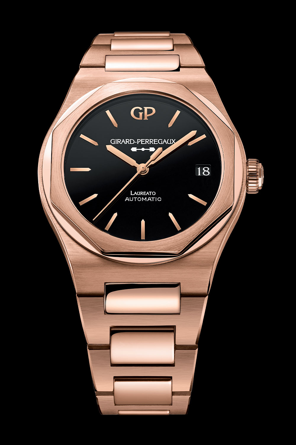 It might come as a surprise to newcomers to the watch scene, but the Girard-Perregaux Laureato was one of the precursors of the luxury sports watch and appeared in 1975, just three years after Audemars Piguet’s trailblazing Royal Oak. With its raised octagonal bezel, sleek lines, hobnail dial and integrated bracelet, the Laureato was Girard-Perregaux’s interpretation of the luxury sports watch. In tune with the times, the Laureato was fitted with a slim, ultra-precise COSC-certified quartz movement. Following a period of hibernation, the Laureato was reanimated in 2016 with limited editions, followed by a fifth-generation line-up in 2017. Today the Laureato 42mm family expands with the arrival of a new model in a luxurious 18k pink gold case with a sleek black onyx dial and in-house automatic movement.