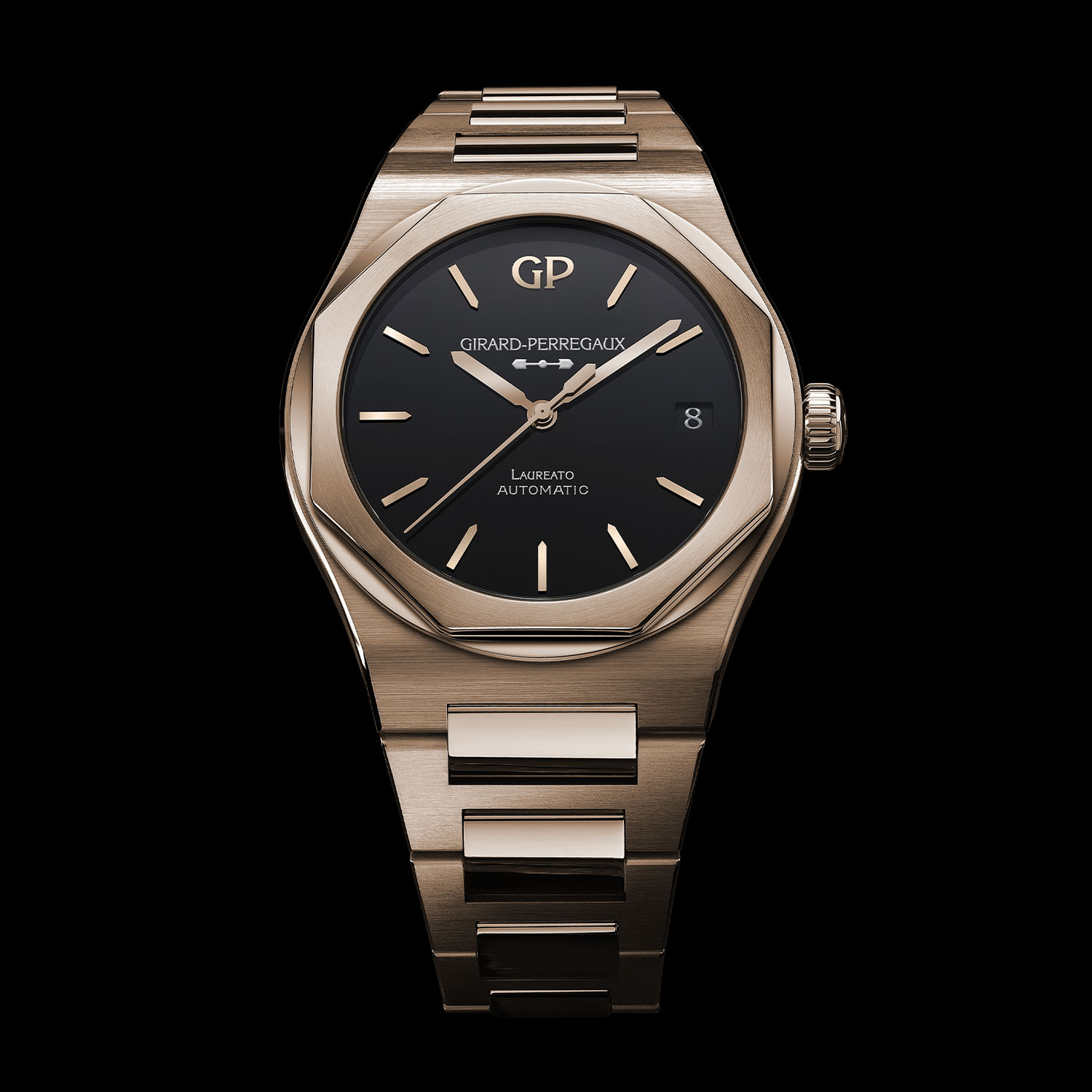 The Laureato graduates in a luxurious pink gold case and bracelet with a sleek black onyx dial.