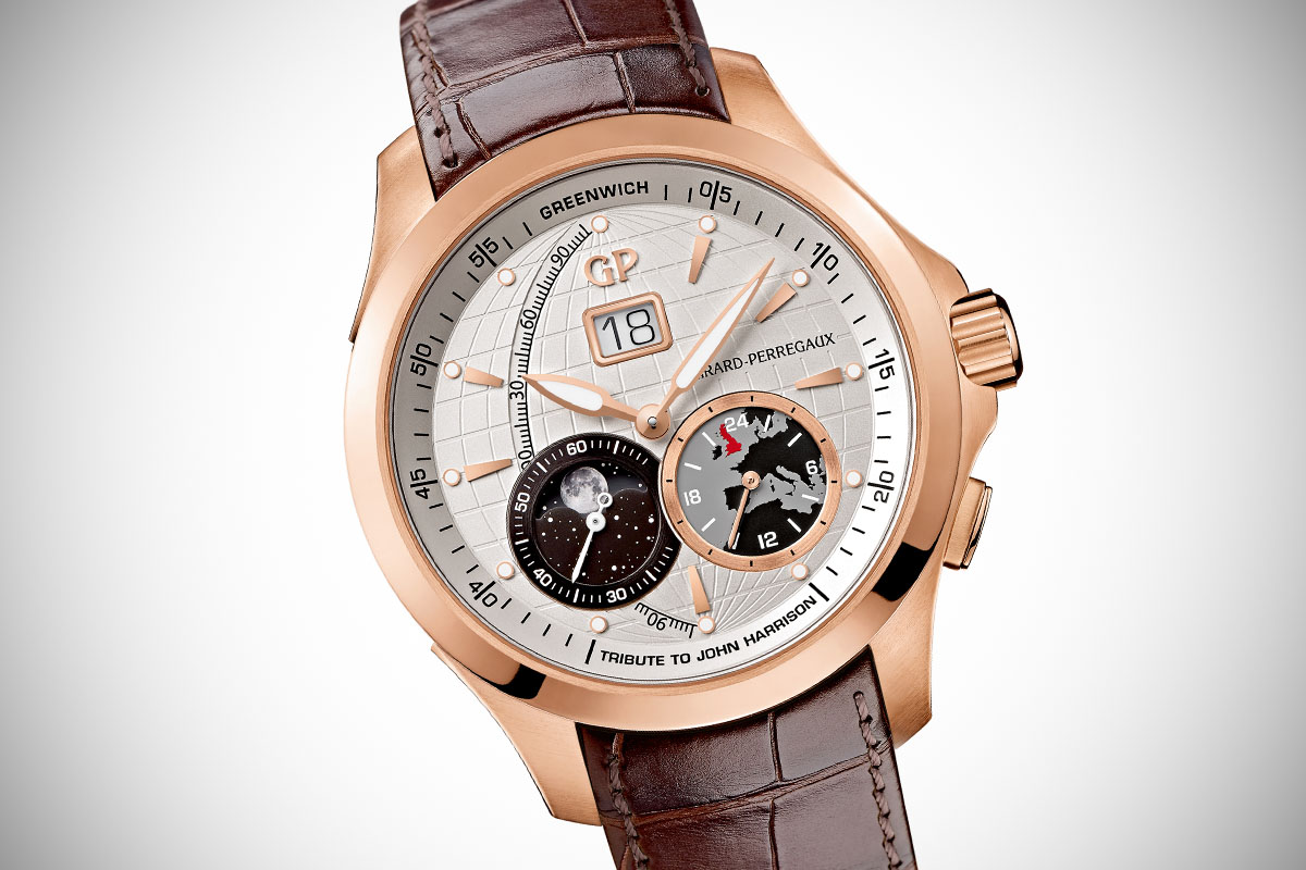 The Traveller Collection by Girard-Perregaux continues to expand. Alongside the Chronograph, which was recently presented in full black titanium DLC here or in pink gold and that we reviewed in stainless steel, there is also a simpler edition, with large date and Moon-Phase. Now GP comes with an intermediate edition (in terms of complication) with an extra GMT function. Welcome the Girard-Perregaux Traveller Large Date, Moonphase & GMT collection, including the John Harrison Limited Edition.