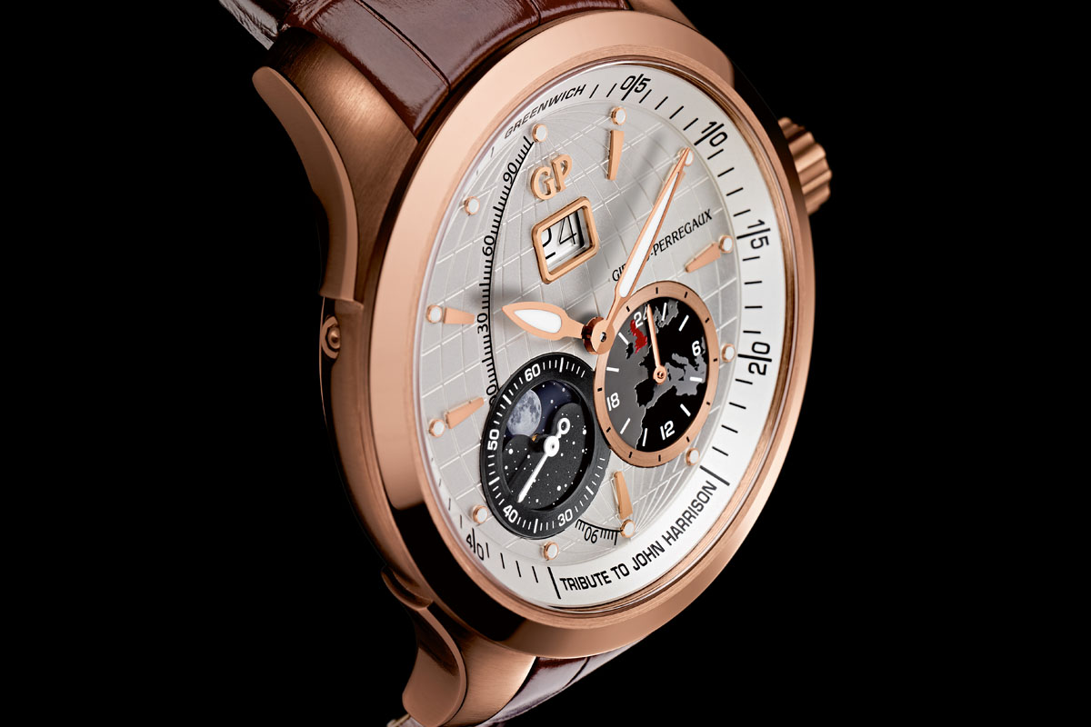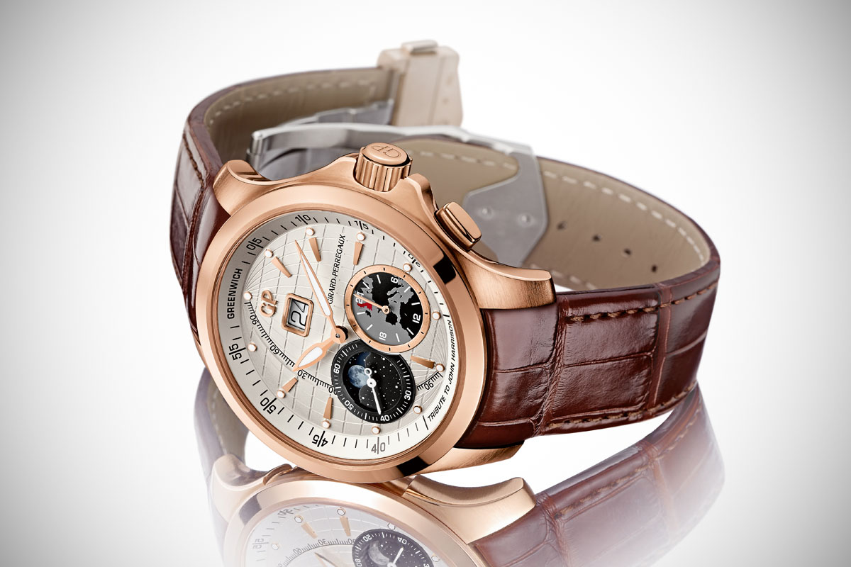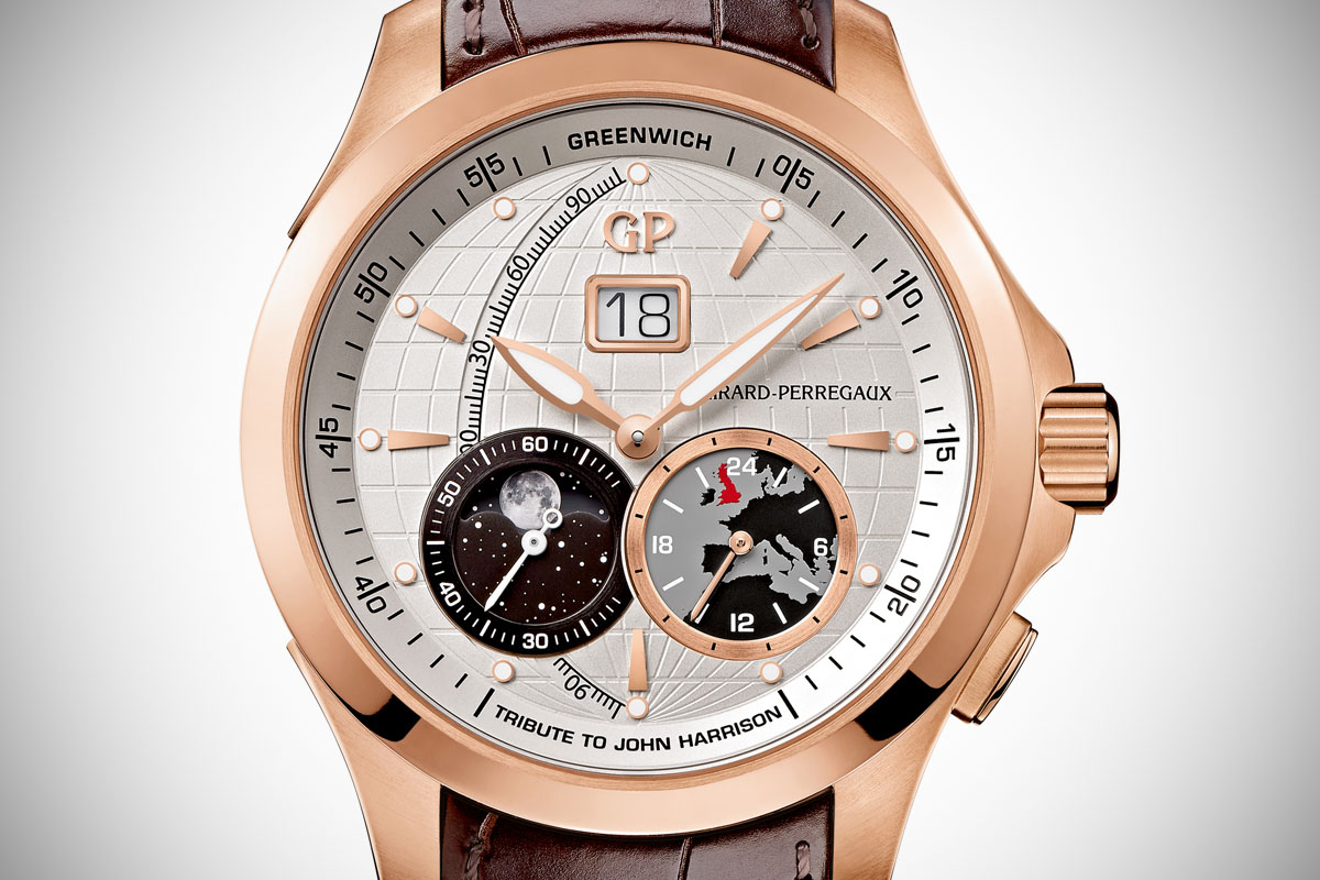 The Traveller Collection by Girard-Perregaux continues to expand. Alongside the Chronograph, which was recently presented in full black titanium DLC here or in pink gold and that we reviewed in stainless steel, there is also a simpler edition, with large date and Moon-Phase. Now GP comes with an intermediate edition (in terms of complication) with an extra GMT function. Welcome the Girard-Perregaux Traveller Large Date, Moonphase & GMT collection, including the John Harrison Limited Edition.
