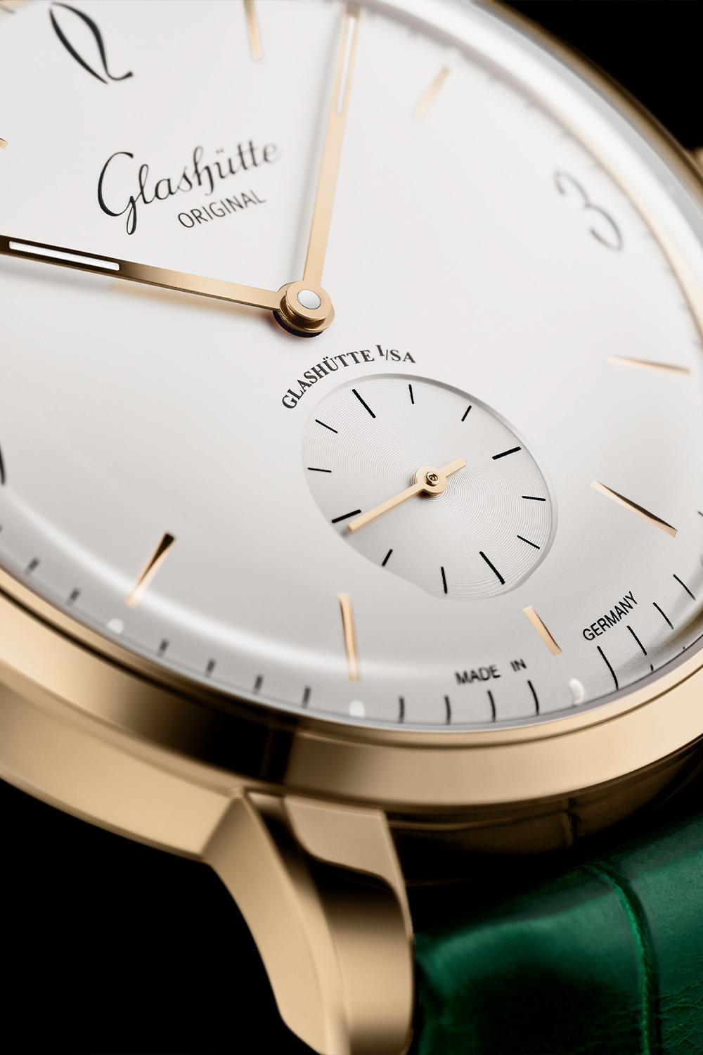 The Glashütte Original Sixties Small Second is paired with a green Louisiana alligator leather strap with a gold pin buckle, indicating GO designers wanted this new classic timepiece to stand out. This deep green hue strap makes its debut in the Vintage Collection – and the Sixties line was introduced in 2007. The Sixties Small Second is available worldwide at Glashütte Original boutiques and from selected retailers; the price is EUR 17,900 incl. VAT.