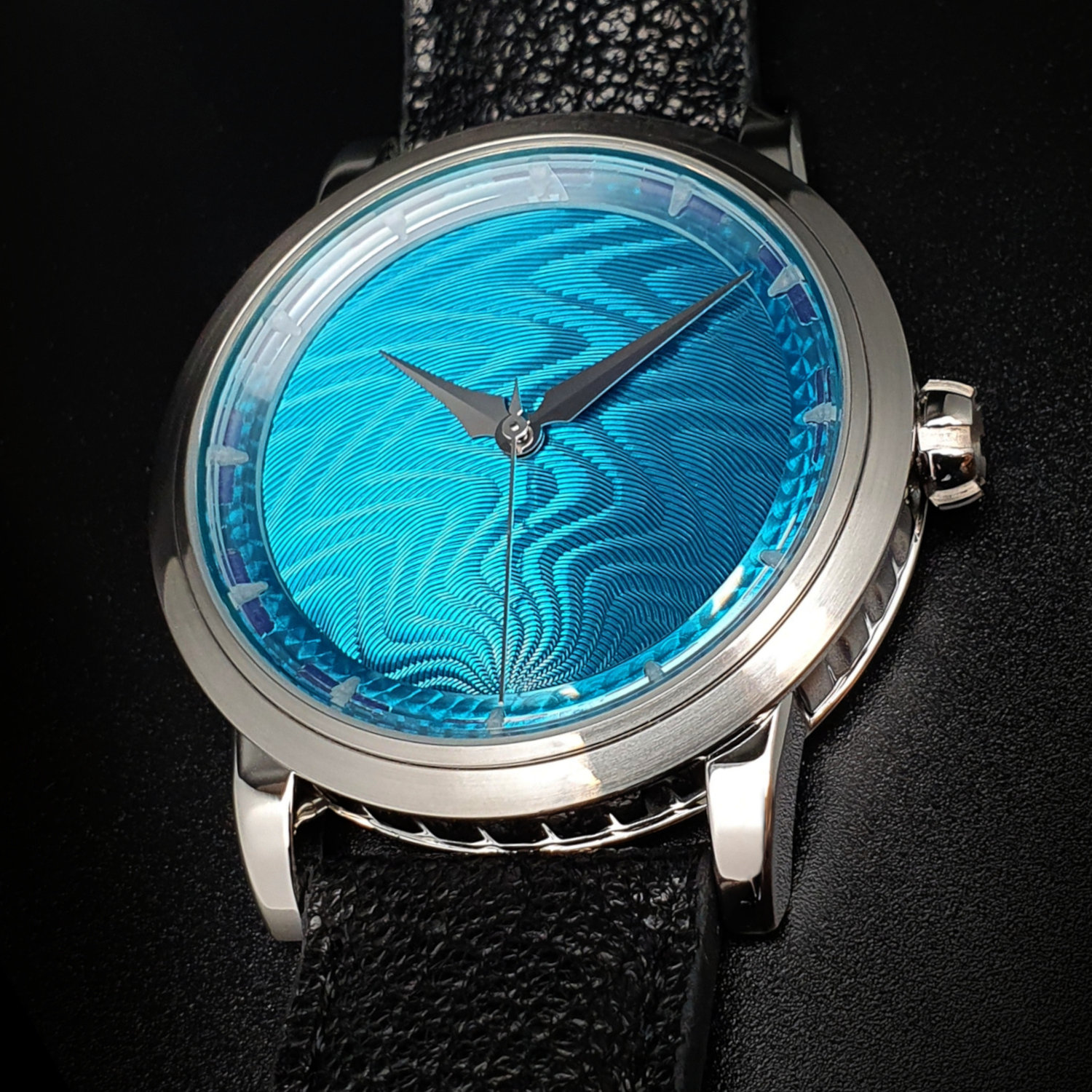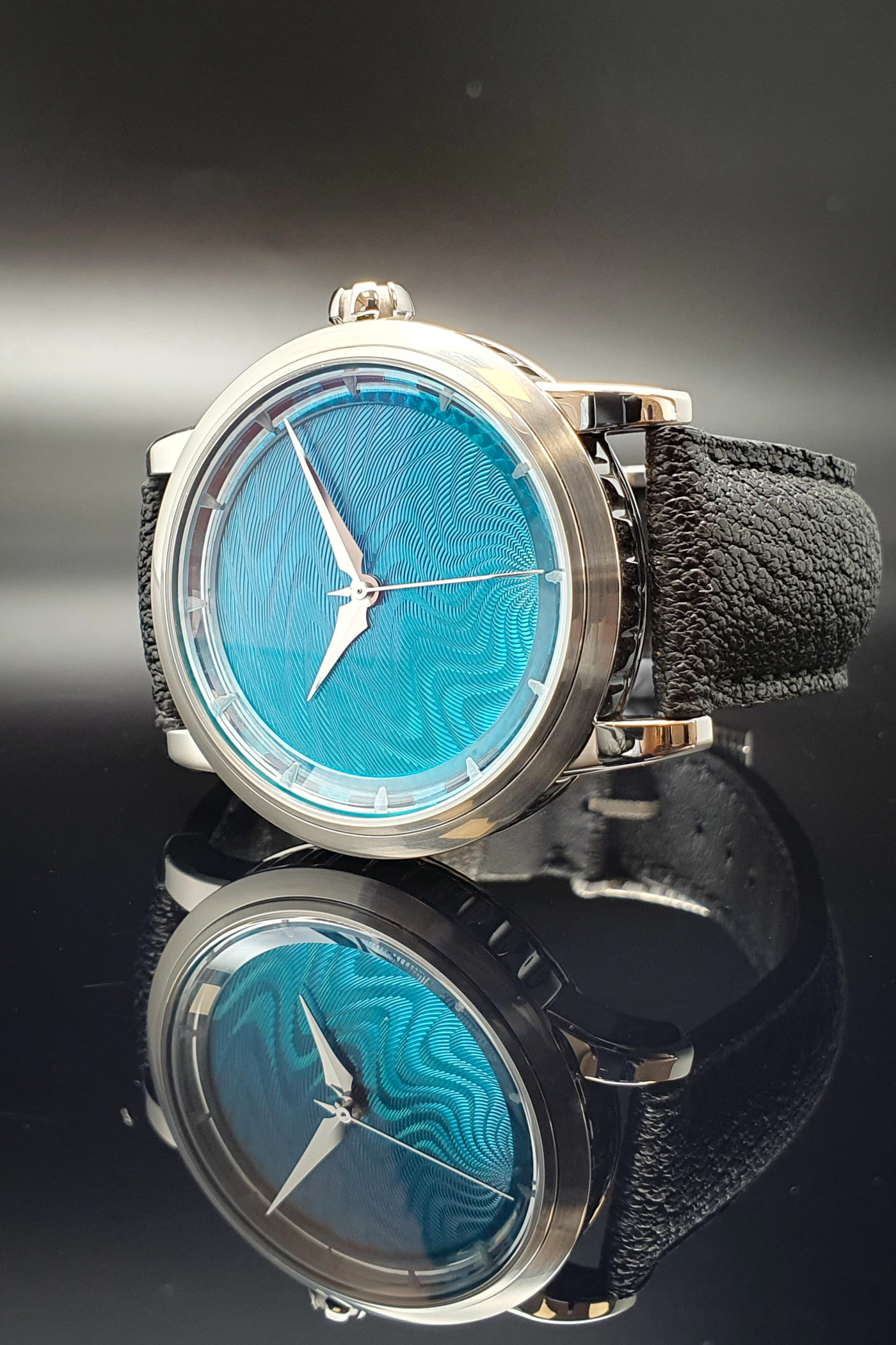 The beauty in most of GoS’ watches lies in the intricate details of the Damascus steel cases and dials, or the wavey guilloché patterns inspired by the Aurora Borealis, or Northern Lights. The Sarek Rissa falls under the latter category, and even though it lacks the intricate patterns of the unique forged metal GoS is known for, it’s still remarkably detailed. Each dial is hand-turned by Jochen Benzinger, one of the absolute best guilloché craftsmen in the business.