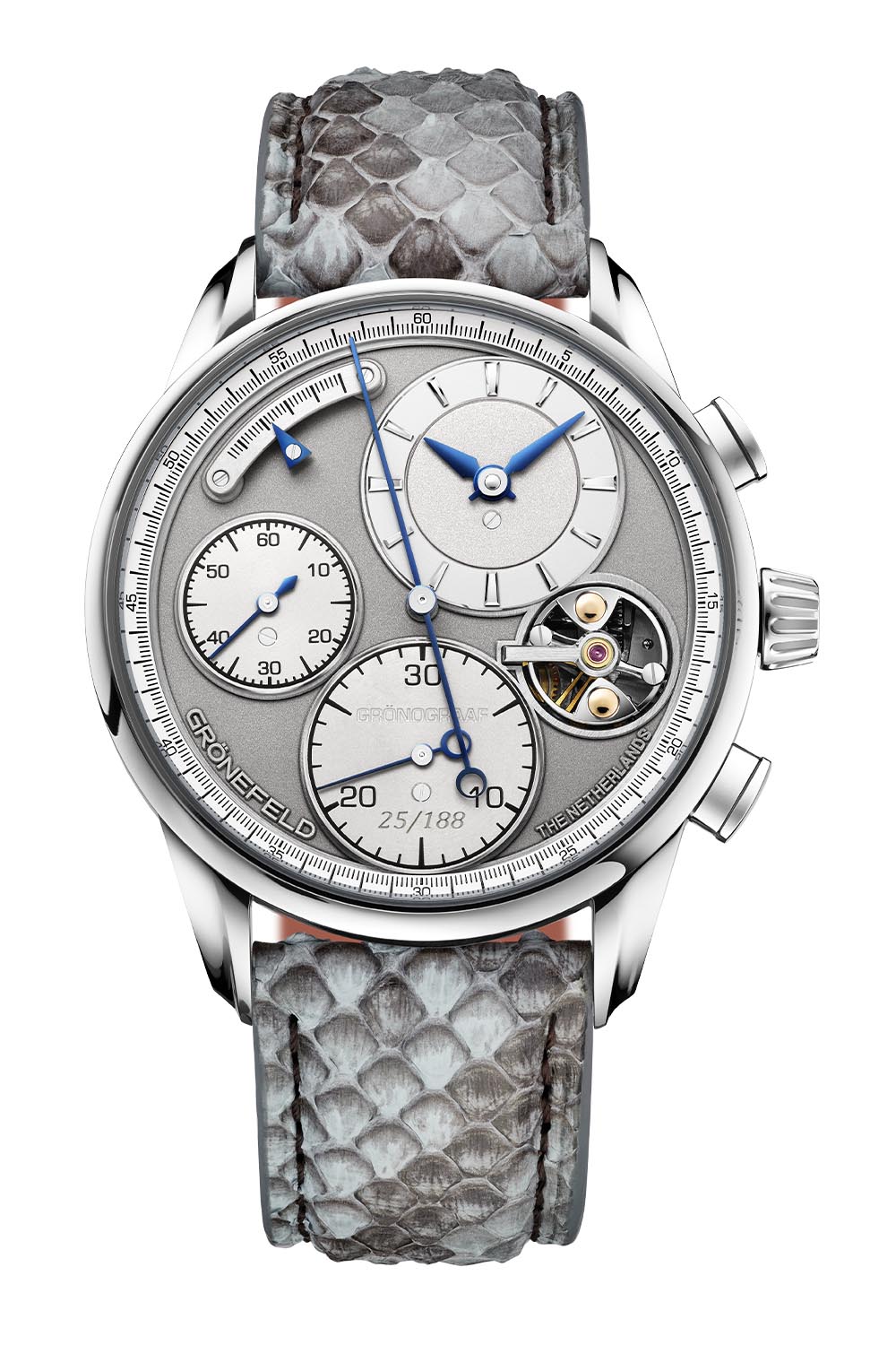 The Grönefeld 1941 Grönograaf will be released in two limited editions of 188 pieces in stainless steel and 25 pieces in tantalum. The price will be EUR 155,000 in steel and EUR 165,000 in tantalum. For more details and to place a reservation, please visit www.gronefeld.com.