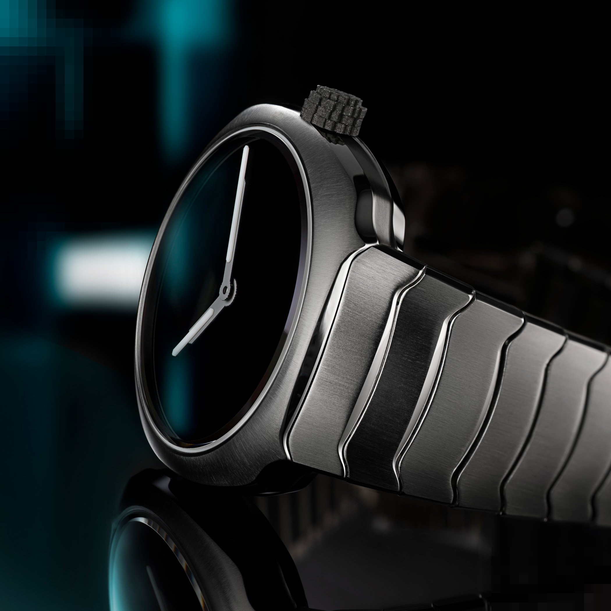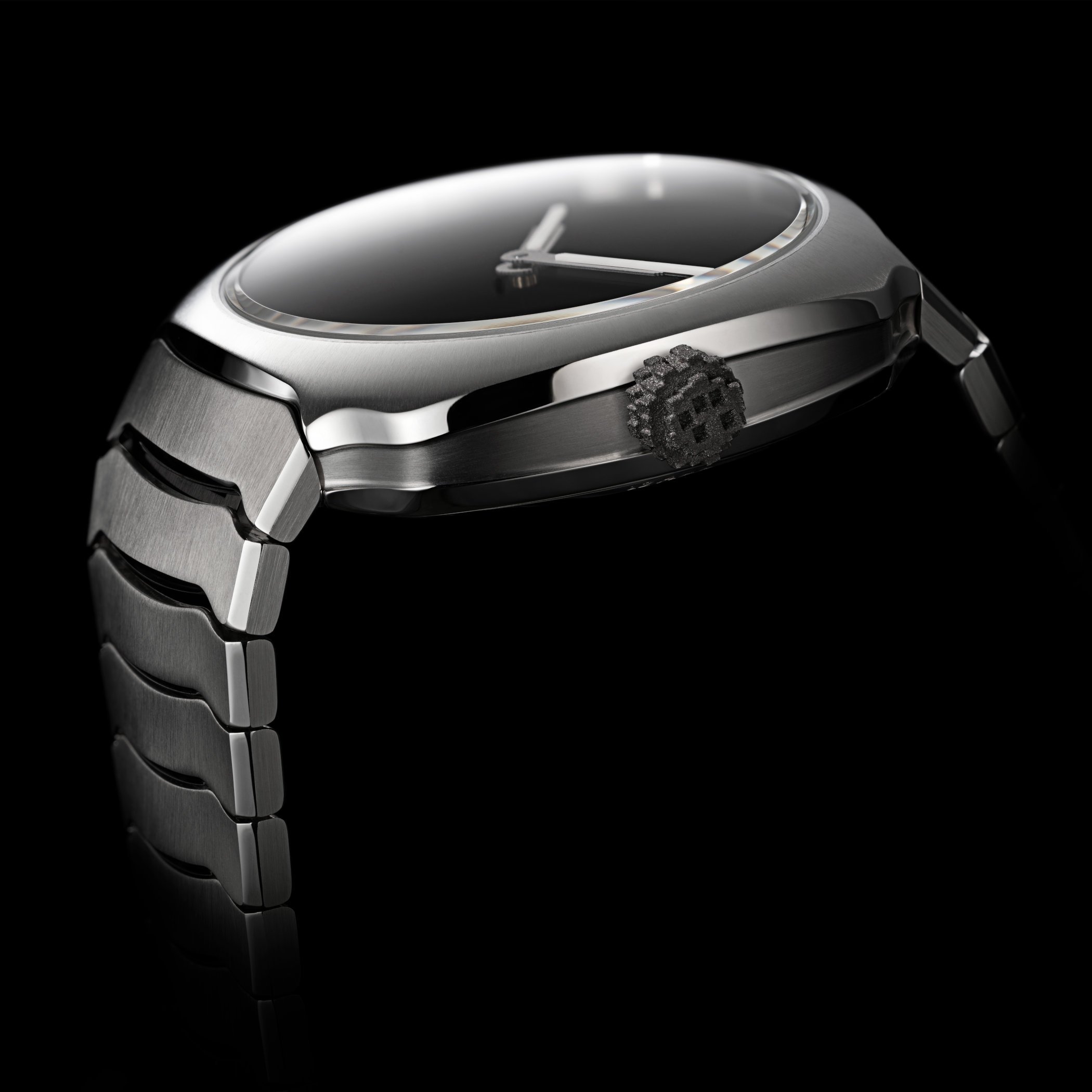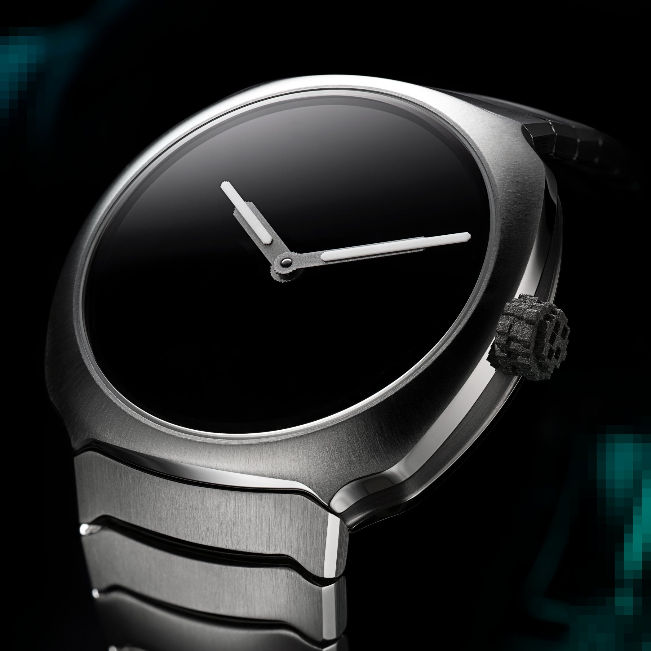 Seven years ago, Moser surprised the watchmaking world with a dial crafted from Vantablack, the darkest synthetic material on Earth capable of absorbing up to 99.965% of radiation in the visible spectrum. Featured on board the Endeavour Perpetual Moon Concept, the alien material also appeared on the Streamliner Tourbillon, creating an infinite black hole to host the tourbillon. Light-devouring Vantablack material is featured on the dial of the Streamliner Genesis 2 to dramatic effect. With no indices, no logo – no nothing – the only elements suspended over the black void are the hour and minute hands fitted with a strip of Globolight. Respecting the skyscraper silhouette of the Streamliner family’s hands, the edges are jagged and pixellated, matching the gritty texture of the crown.