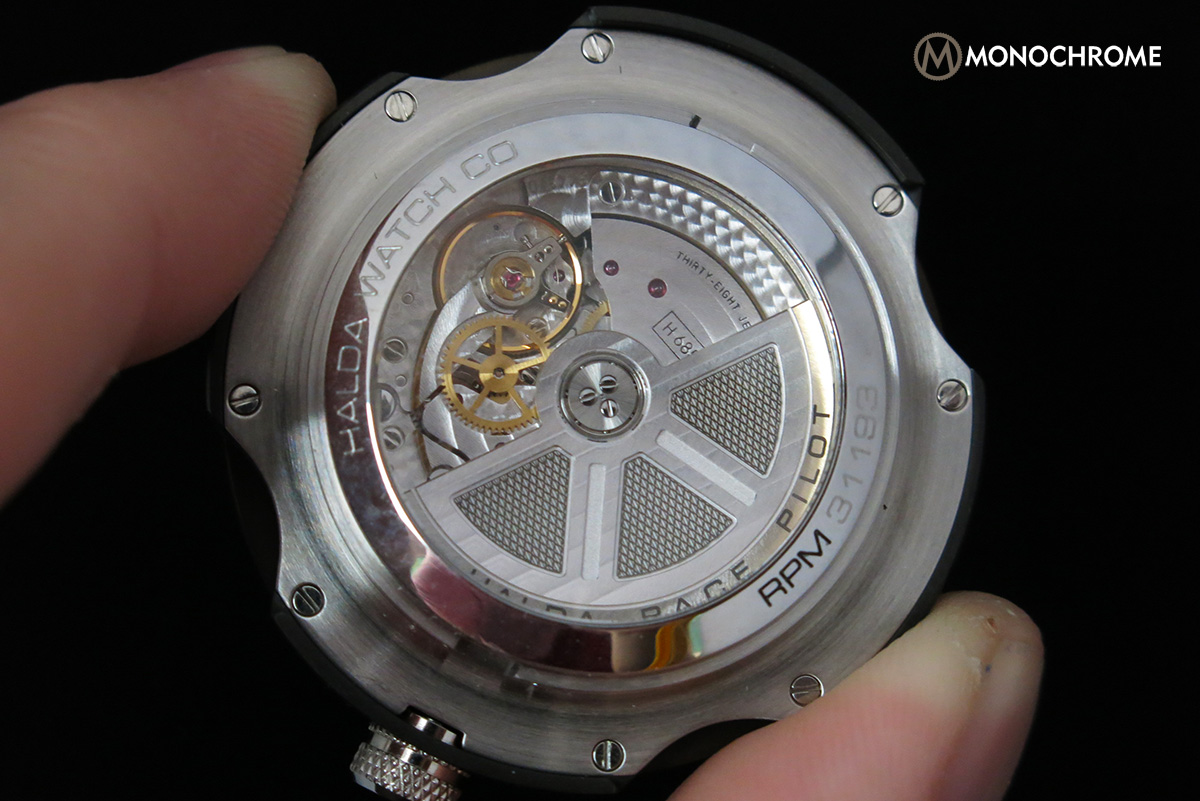 The dial of the mechanical module is built up with 29 individual parts and available in three different colors: Gun Metal, Black Luminova and Silver Geneva. The Halda at hand has the Black Luminova dial in place. The dial is finished with multiple decorations including horizontal Côtes de Geneva on the hub like applique and Clous de Paris for the base of the dial and luminous material on the hands, markers and numerals.