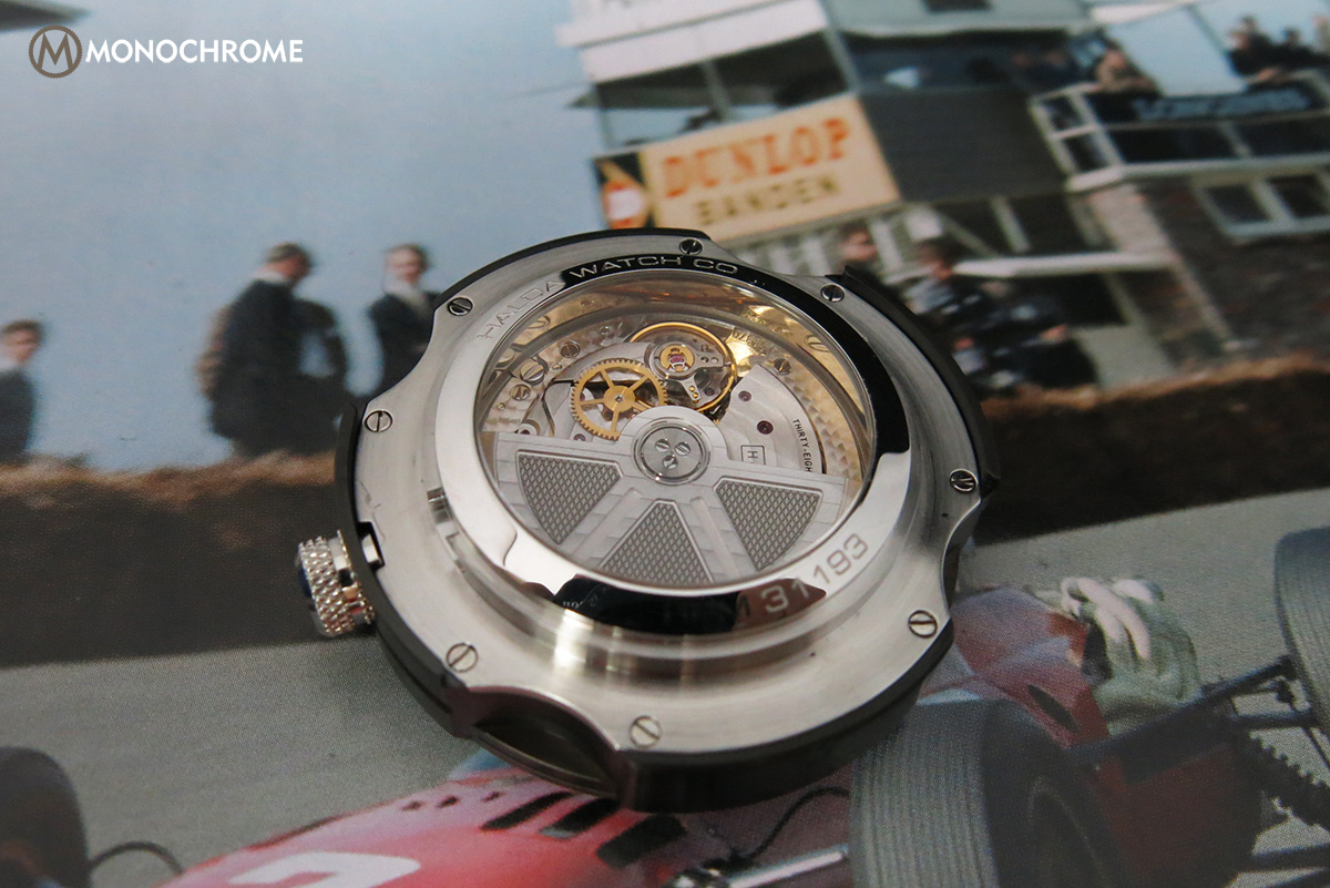 A power reserve is located at 2 o’clock, showing between 0 and 60 hours and looking very much like a fuel gauge out of a dashboard. The red-tipped hand and layout of the power reserve scale make for easy reading of the remaining energy in the movement. This befits the racing theme of the watch very well, which is further enhanced with a wheel-like applique placed on the dial. The “spokes” of this applique function as hour markers for every other hour, with Arabic numerals at 12, 2, 4, 8 and 10 to complete it. The end-result is a visually impactful dial, with a little bit of a designer-edge. Still, it fits the intended goal of the watch very well.