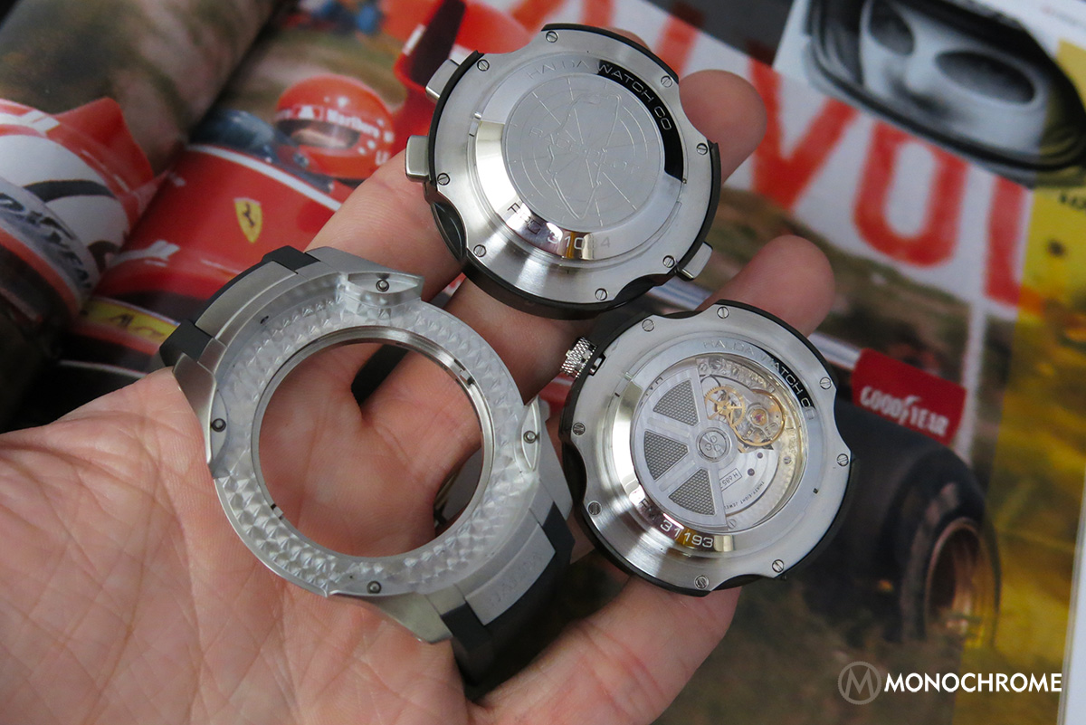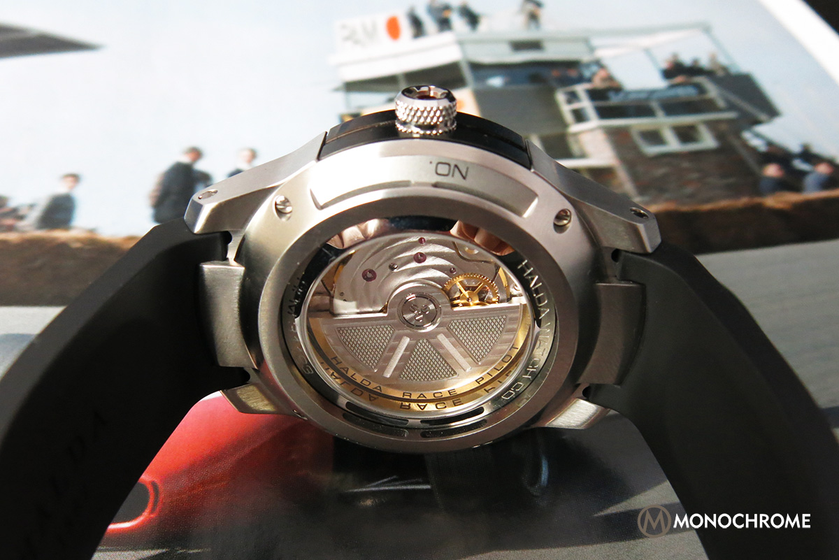 The 45mm wide and 17.6mm thick cases feel sturdy, with sharp lines and a good level of finishing. The base of the case holder, only visible without a module, is decorated with perlage graining, as can be seen in the pictures. The Race Pilot is neatly fitted to a 22mm wide rubber strap with folding buckle. The rubber is smooth to the touch, and offers a good, comfortable fit. Although I am not the biggest fan of rubber straps this one is very well executed.