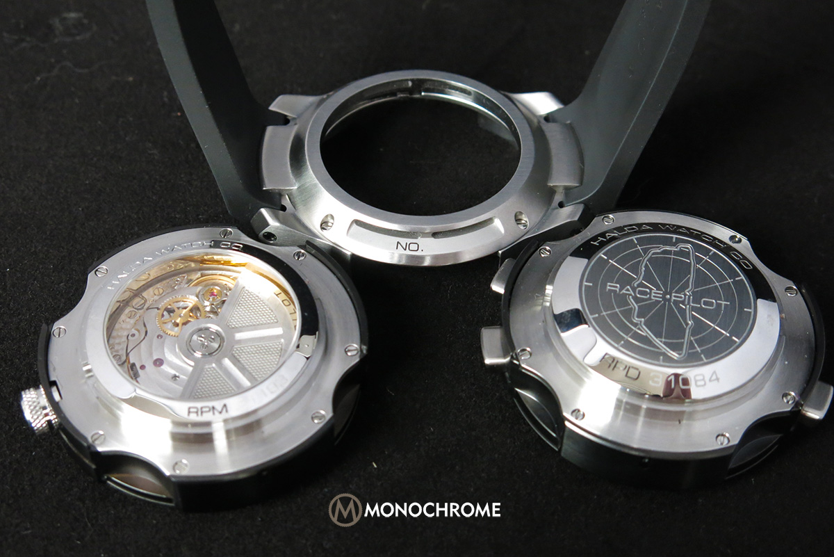 Let’s begin with the case holder: the part that you need regardless of which module is snapped in, digital or mechanical. The case holder is constructed in stainless steel, and features two inconspicuous buttons at 12 and 6 o’clock, with “HALDA” engraved on one of them. You press down on them, and the module is released from its clasps. Then you can remove it, and replace it with the other. The fit of the module inside the case holder is immaculate, and intuitive due to the four buttresses that fit into corresponding openings in each module. The remaining module can be neatly stored in a leather pouch with foam padding to keep them safe.