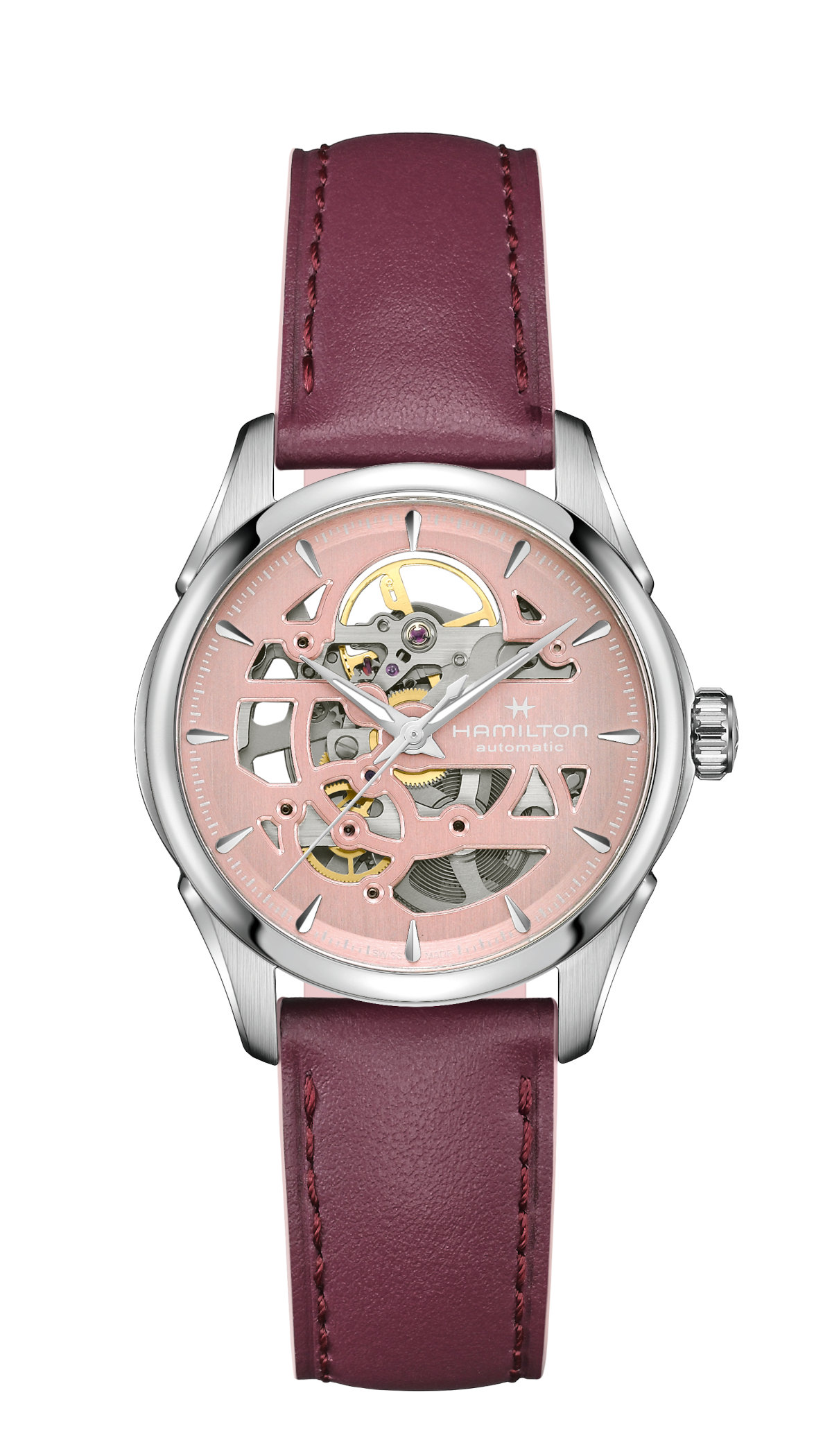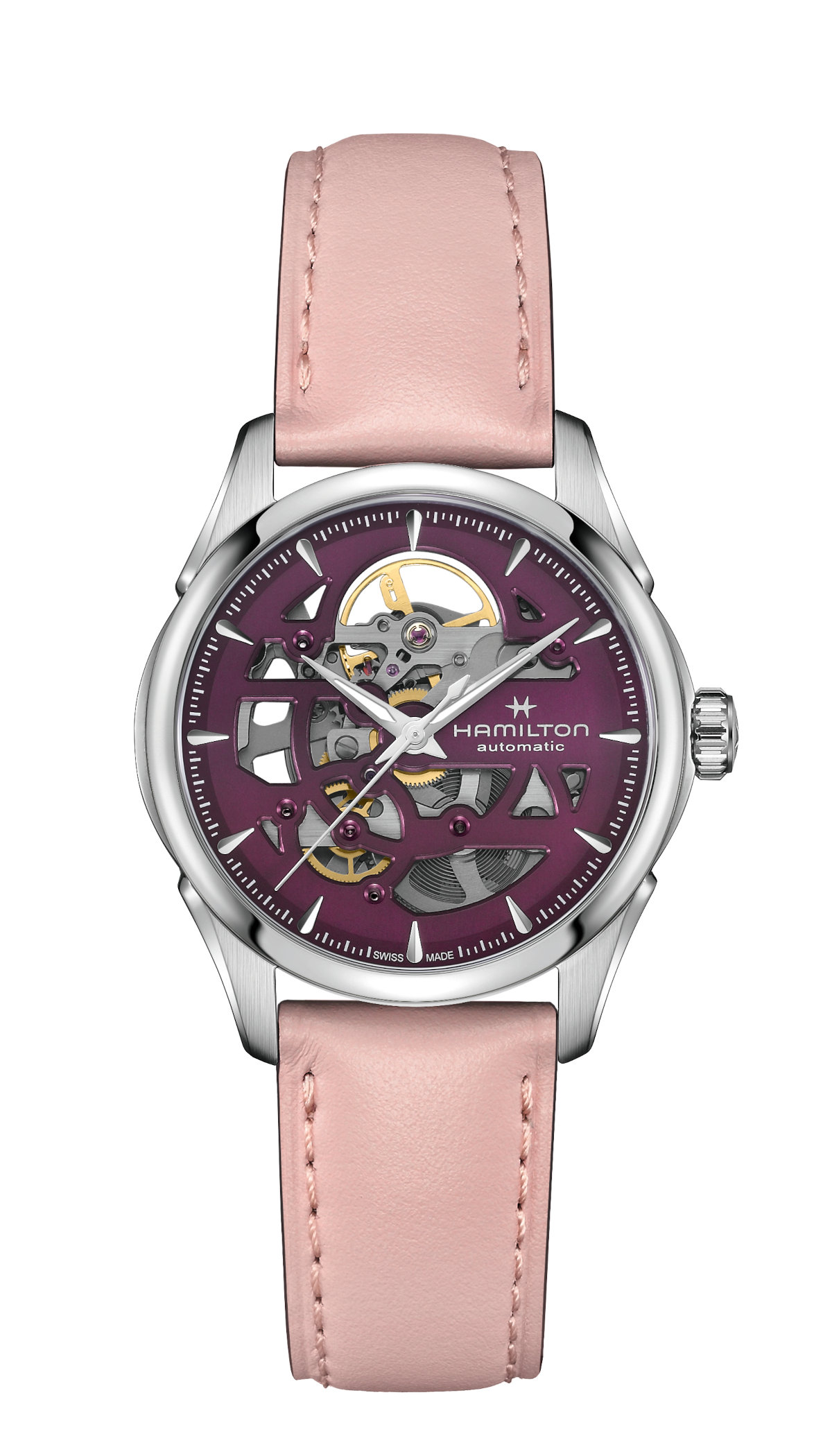 Both sizes of the new Hamilton Jazzmaster Skeleton are fitted to either a leather strap, plum or pink for the 36mm variant and blue or green for the 40mm size, or a stainless steel bracelet with a folding clasp. Prices range from EUR 1,245 for the smaller one on leather or EUR 1,295 for a steel bracelet to EUR 1,325 for the larger of the two on a leather strap or EUR 1,375 for the bracelet.