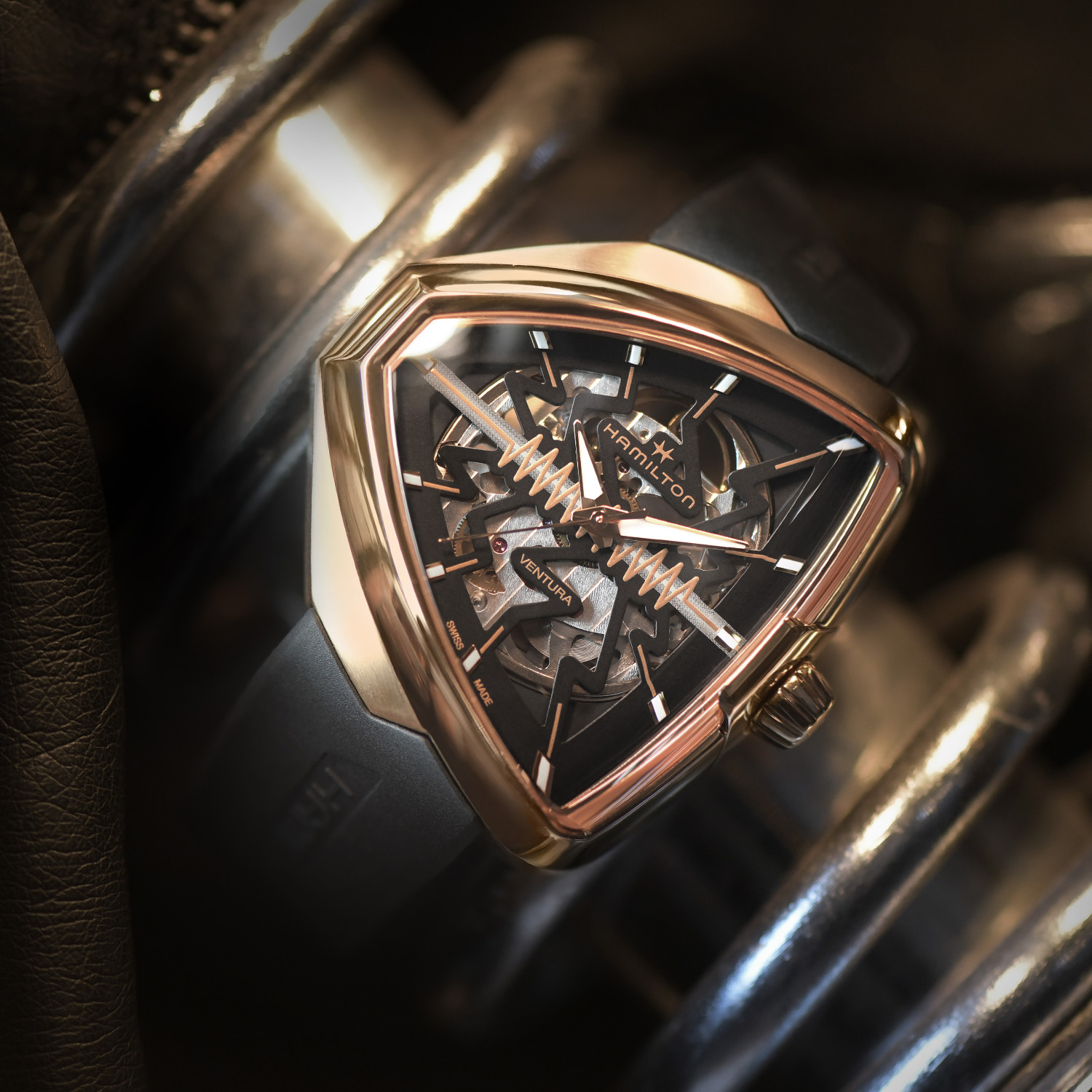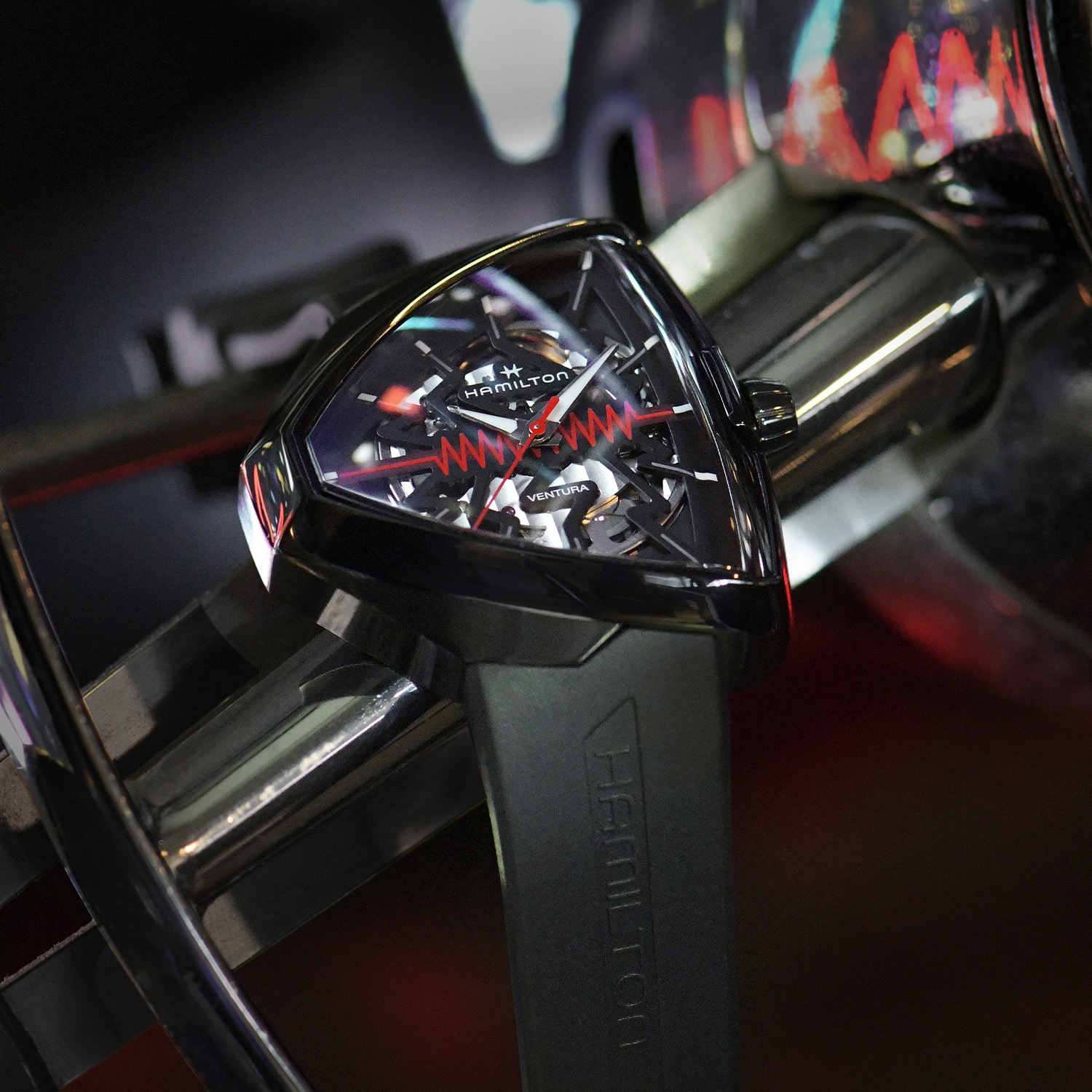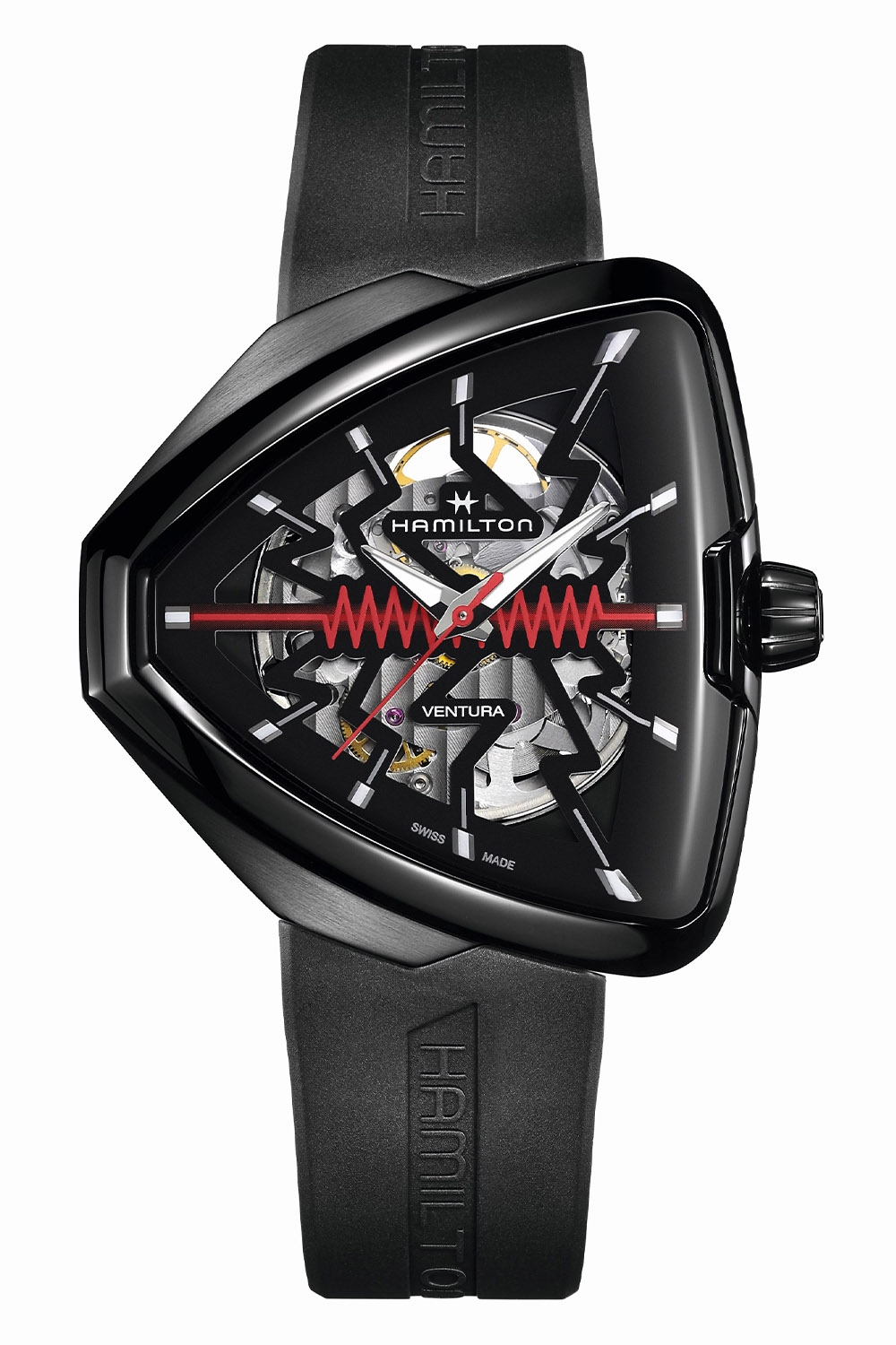 Hamilton sent a shockwave through the industry in 1957 with the world’s first production battery-powered wristwatch, the Electric. Available among other designs in a futuristic triangular case and pulsing electric graphic on the dial highlighted the new tech, and it became an icon when Elvis Presley wore it in the 1961 movie, Blue Hawaii. The design made a comeback in 1988 with a near carbon copy of the original but sported a more accurate and reliable quartz movement. The latest Hamilton Ventura Elvis80 Skeleton mixes the winning formula of the original with the Ventura Skeleton Limited Edition for an edgy, modern throwback.
