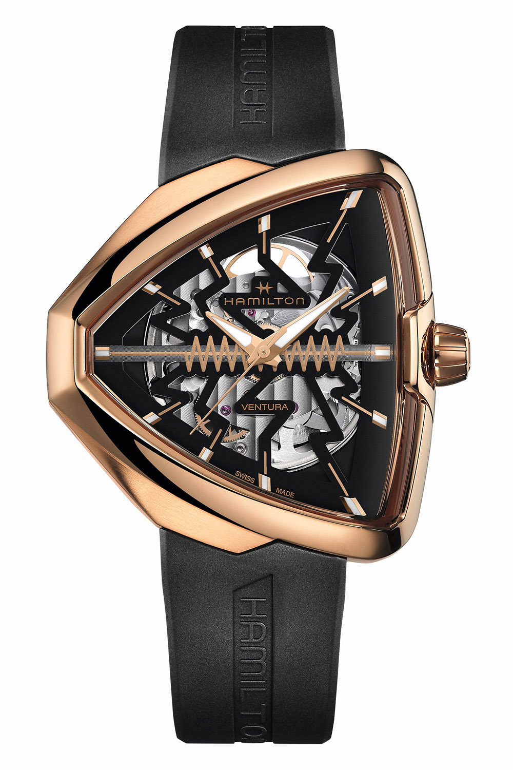 The dial really differentiates these latest Hamilton Ventura Elvis80 Skeleton models from the others. It’s skeletonized in a similar way to the Ventura Skeleton Limited Edition (featured in the movie Spider-Man: Homecoming), but straight, web-like lines are replaced with ‘electric’ zigzags reminiscent of the original 1957 theme. Reinforcing this is the classic zigzag across the dial’s centre that’s a first for the Ventura Elvis80 line. It is red on the black model and gold on the rose gold model. The indices are grey and white on the black model and gold and white on the rose gold model, with the white being Super-LumiNova. The hour and minute hands are also filled with white Super-LumiNova and are silver on the black model and gold on the rose gold model, while the seconds hand matches the zigzag on the dial (either red or gold). So, there’s a lot going on, but it’s not overly busy. Behind all of this is the automatic movement that’s clearly visible with Côtes de Genève.