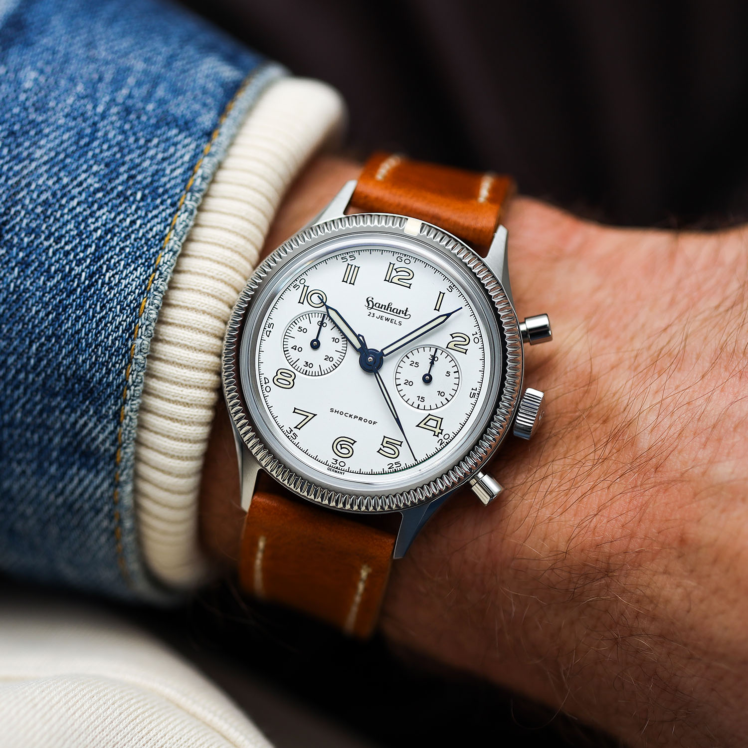 Hanhart, the German brand that started life in Switzerland as a manufacturer of stopwatches before relocating to Germany in 1902, gained renown as a producer of Flieger (pilot’s) chronographs. In the mid-1950s, Hanhart built the 417, the first pilot’s chronograph for the German Armed Forces, with an emphasis on robustness, reliability, and readability. In circulation until 1963, the 417 was retired, allowing Hanhart to focus on stopwatches. But there was another lesser-known Hanhart 417 waiting in the wings, known among collectors as the Moby Dick. Identical in build to the 417 but with a white dial, the Moby Dick was adopted by admirals and doctors in the navy and, given its scarcity, had become a coveted collector’s piece.