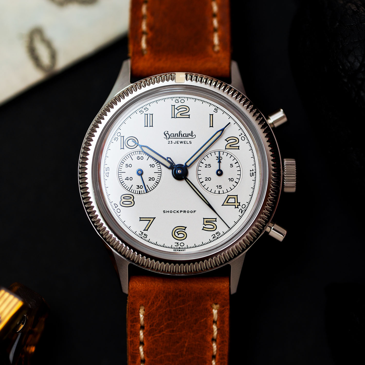 In 2020, Hanhart reissued the legendary 417 pilot’s chronograph. While the case and dial faithfully respected many traits of its ancestor, the modern version of the Hanhart 417 ES reflected contemporary specifications with a larger 42mm, 100m water-resistant case and a Sellita manual-winding calibre. Later, a 39mm joined the collection.