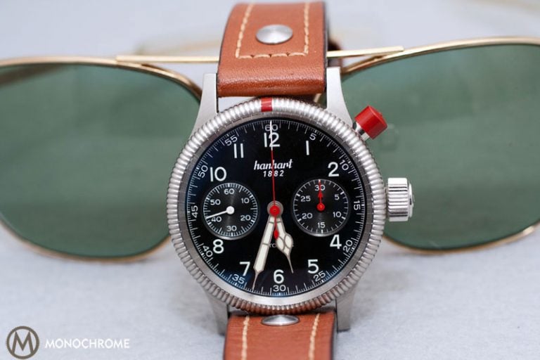 In 2020, the brand re-edited this cool watch with the modernised (not too much) and accessible Hanhart 417 ES Reissue Pilot’s Chronograph we reviewed here. A very attractive watch with historical relevance, it combined good design, pleasing quality and a fair price. But, the case might have been a bit too big for some. This year, the brand, together with some partners, has decided to go back to the original dimensions, first with Revolution and a bronze case. Second, this new 417 ES Red Lion, which is made of steel and brings several updates to the design for an even more attractive style.