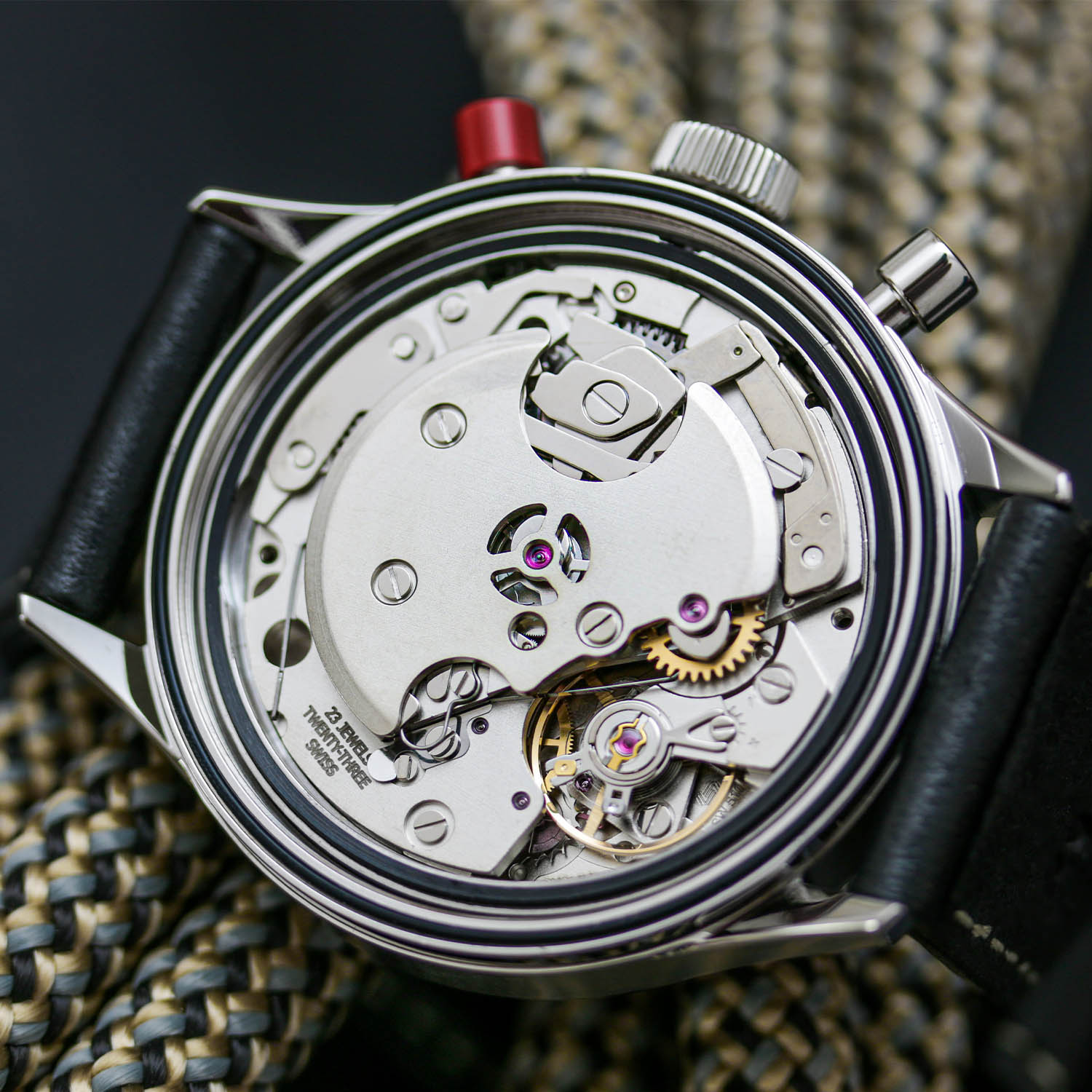 Inside is a well-known, robust hand-wound movement, the Sellita SW 510 M. Placed under screwed steel back with historical engravings, this cam-lever chronograph runs at 4Hz and stores up to 58 hours of energy when fully wound.