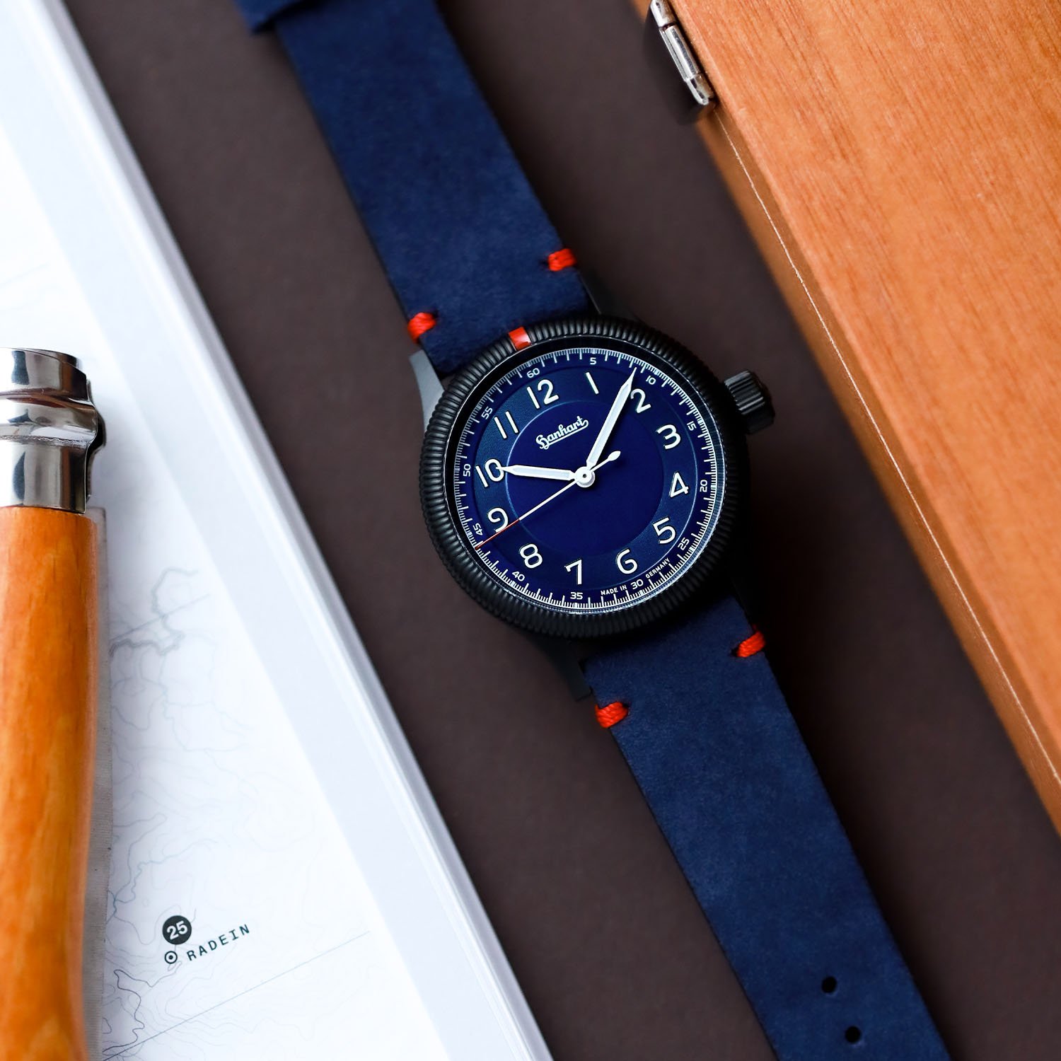 The dial provides the name of this Pioneer One edition; it is dark blue with white numerals, and the hands are treated with Super-LumiNova for readability in the dark. The dark blue dial serves the same purpose in the daytime, making the hour indices stand out, so you will know what time it is at a glance. The white and blue combination is aesthetically pleasing, the blue leather strap with a suede finish enhances this feeling, and the red cross stitching on the lugs makes the image of Pioneer Flieger One NightBlue complete.