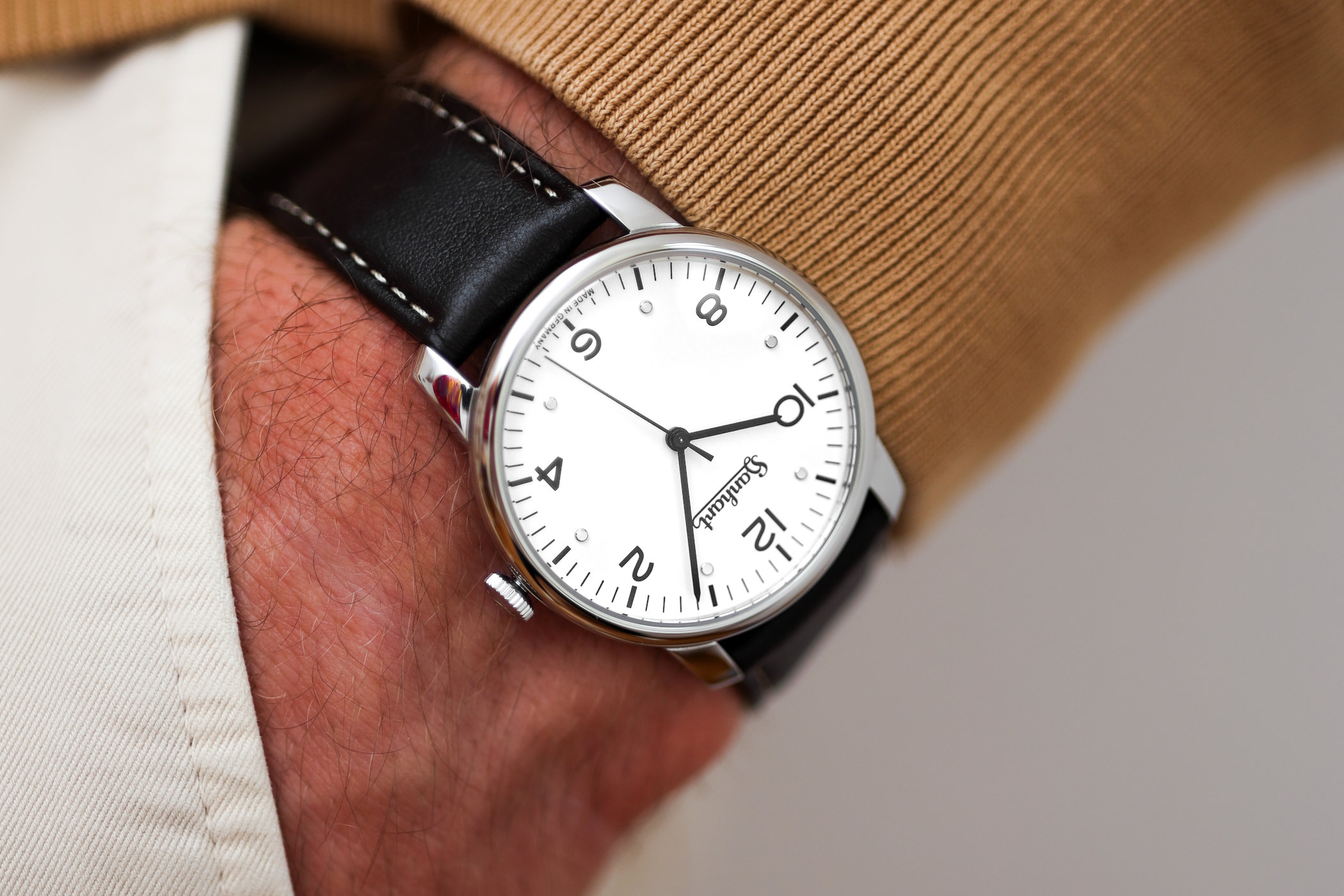 Framed by a slim polished bezel, the dial, available in black or white, is as basic as they come with nothing but the essentials. The main design feature appropriated from the historical model concerns the indices. Other features like the subsidiary small seconds counter and the blued hands have not made the cut. Punctuating the Arabic numerals at 12, 2, 4, 6, 8 and 10 o’clock are six applied dots, which appear to be filled with luminescent material; we will confirm this when we do a hands-on article with the watch. A bold minutes track, narrow pencil-style hands and the brand’s historical logo complete the picture.
