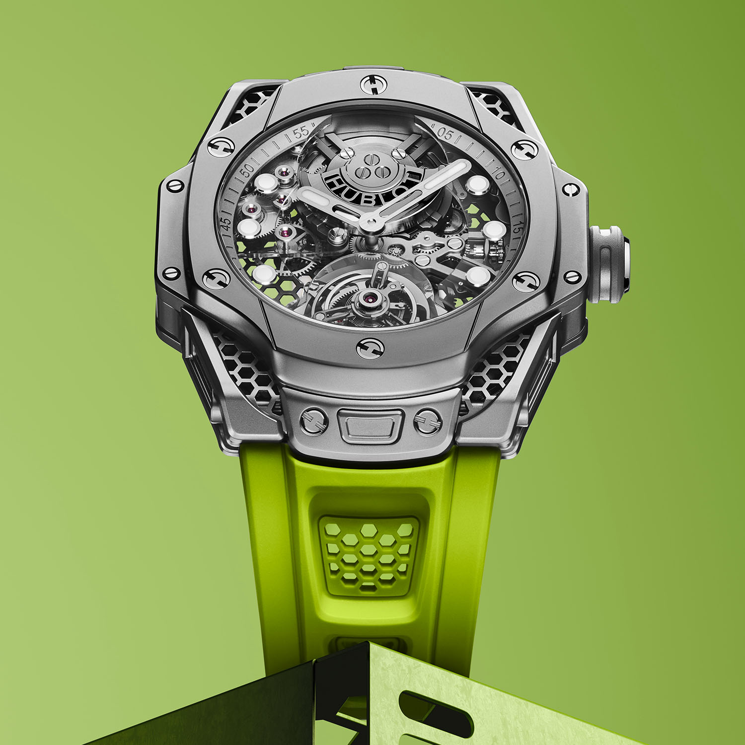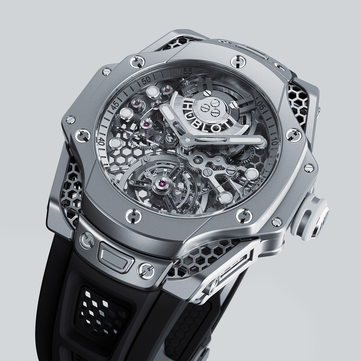 The openworked dial, which is flooded with light from the hexagonally perforated plate, reveals the skeletonised movement with the 60-second tourbillon suspended at 6 o’clock and the Hublot-branded micro-rotor at noon. Again, the number six comes into play with the six circular and luminous hour markers positioned above the movement under a transparent sapphire chapter ring. The rounded central hour and minute hands are also luminous.