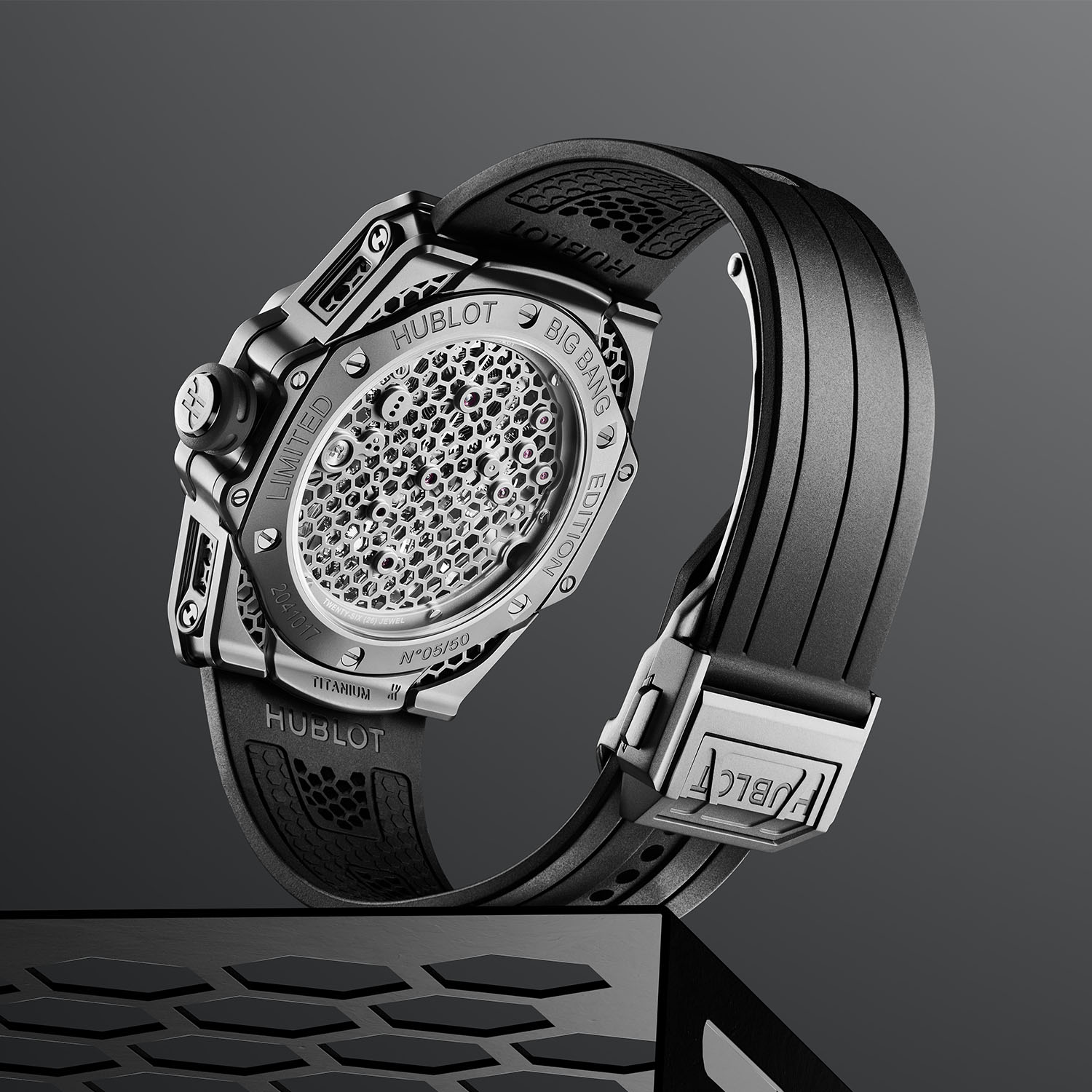 The reverse side reveals the honeycomb-perforated plate and parts of the 282-component automatic HUB6035 calibre beating at 3Hz with a 72-hour power reserve.