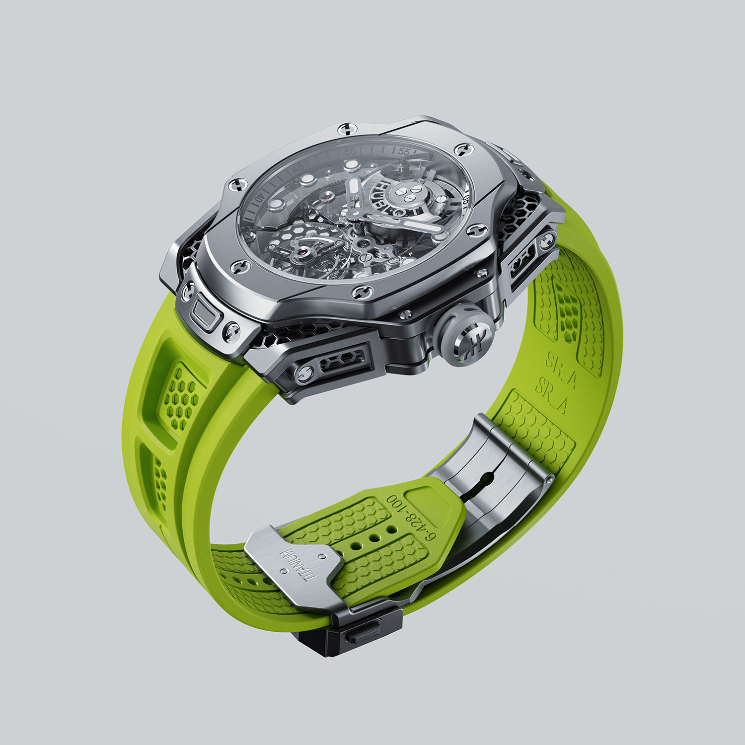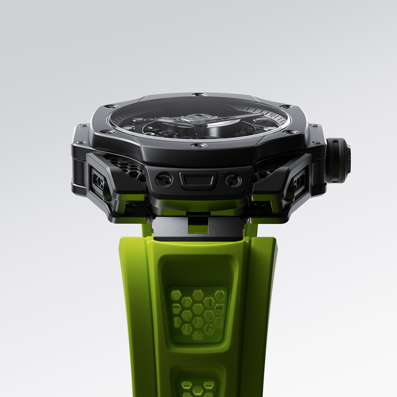 Inspired by Nature’s perfect honeycomb shape, the case middle features a latticework of hexagonal perforations that traverse the dial, introducing light and making the watch even lighter. The contrasting polished, brushed, hammered and perforated surfaces emphasise the radical architecture of the case. Naturally, rubber plays a starring role and is featured in grey on the crown and used for the three rubber straps – white, black and green – accompanying the watch.