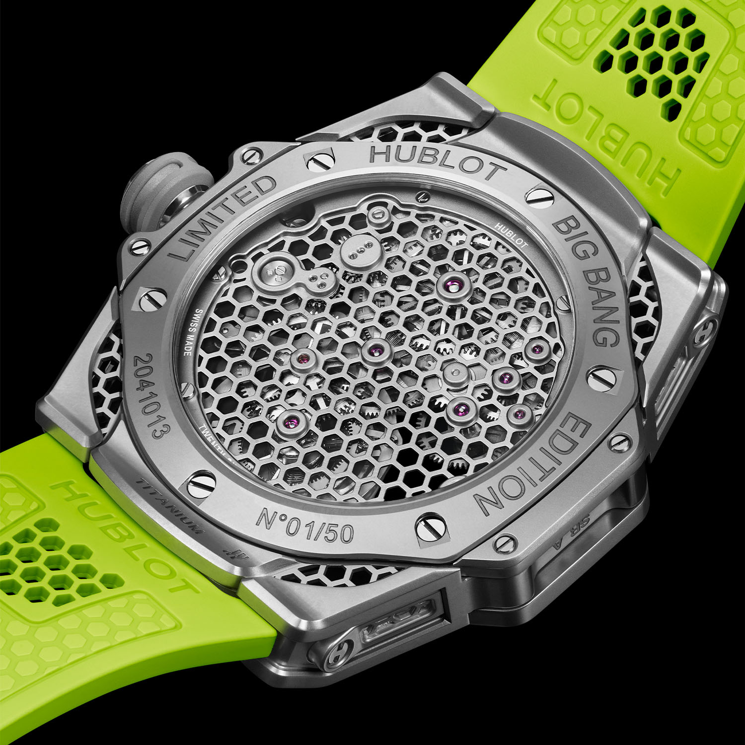 Using a perforated hexagonal motif, artist Samuel Ross infuses the Big Bang Tourbillon with a sculptural, aerodynamic personality.