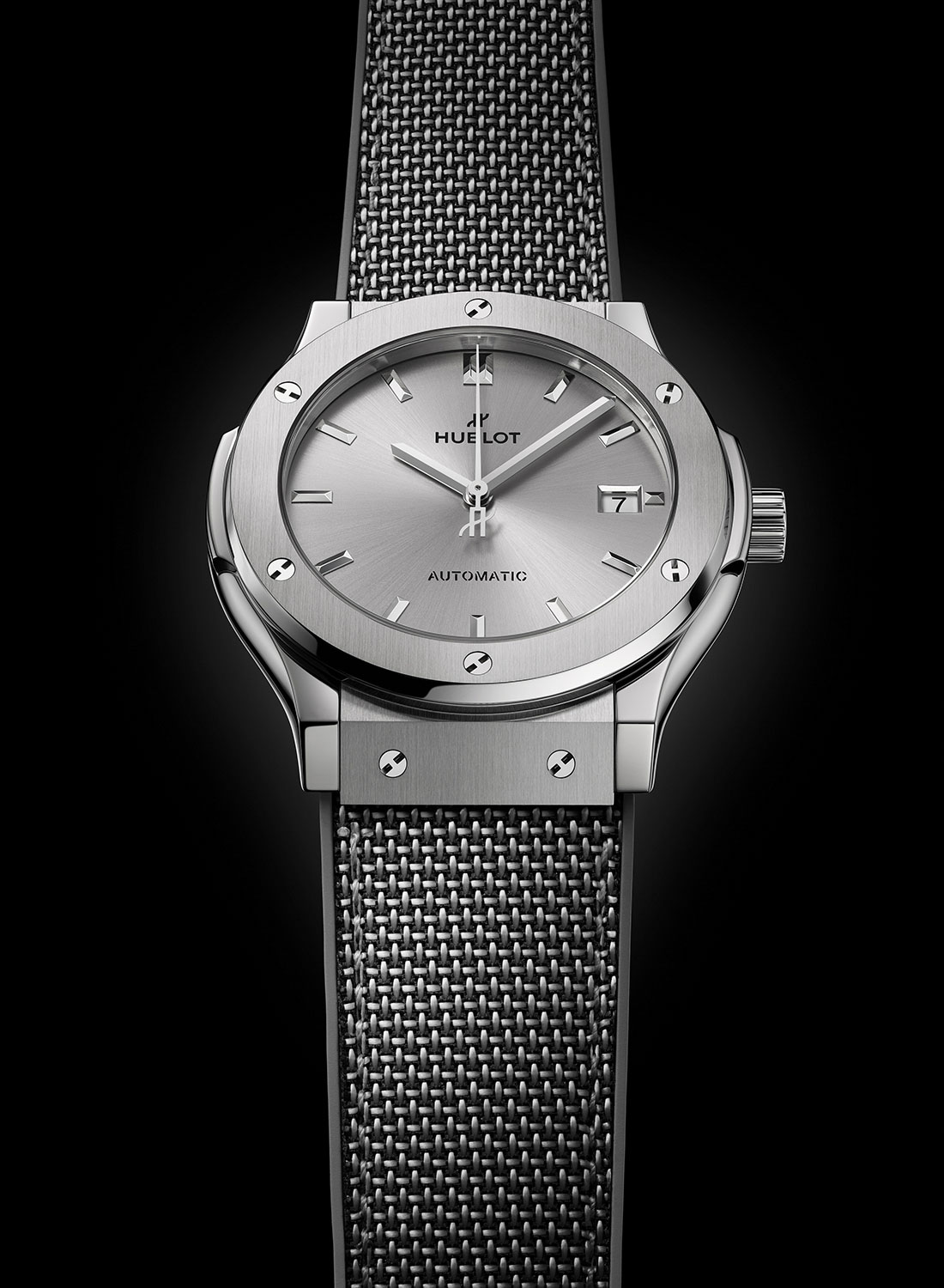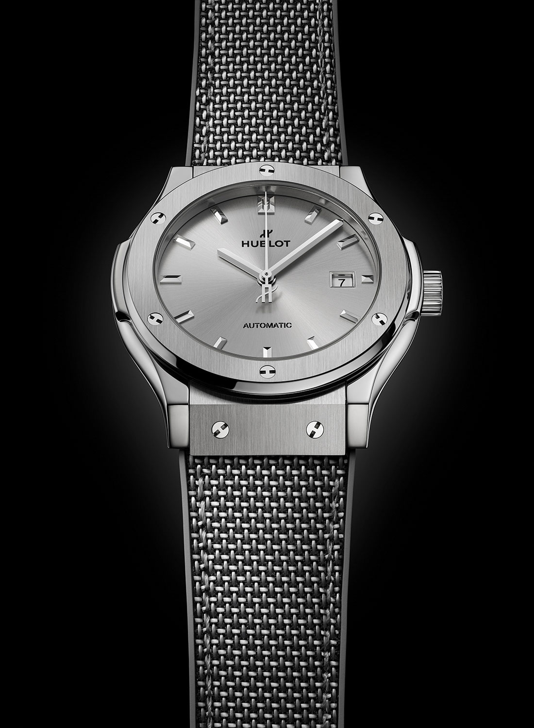 The dials are nigh identical with a grey sunburst finish and faceted applied indices. There are matching, baton-style hour and minute hands and the seconds hand has Hublot’s logo as a counterweight. A date window sits at 3 o’clock. The overall aesthetic is much simpler than Hublot’s louder pieces, including the other two Essential Grey collections, but the Classic Fusion is based on the brand’s original piece from 1980, a 1970s-inspired integrated luxury sports watch.