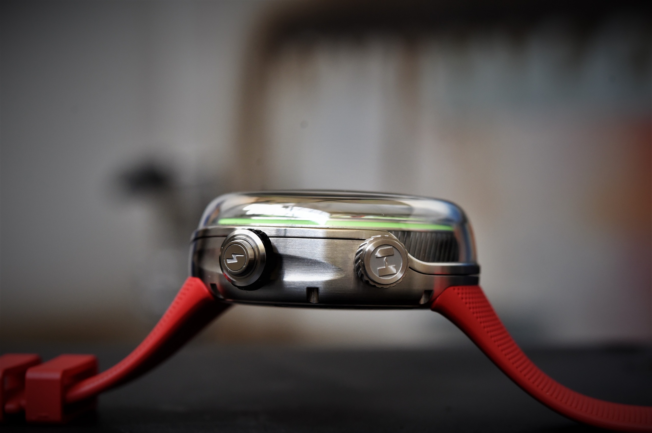 Time became liquid with HYT. With Flow, it is visible both day and night, and on-demand. The new model is presented in an asymmetric 51mm steel case fitted with two crowns. The one at 2 o’clock is your standard crown for setting the time and winding the mechanical movement. The 4 o’clock crown is used to illuminate the watch. Triggered by a pusher, a miniaturized generator stores and dispels energy to activate LEDs. This “backlight” activator works without a battery, as it converts the mechanical energy stored in a barrel into electrical power.