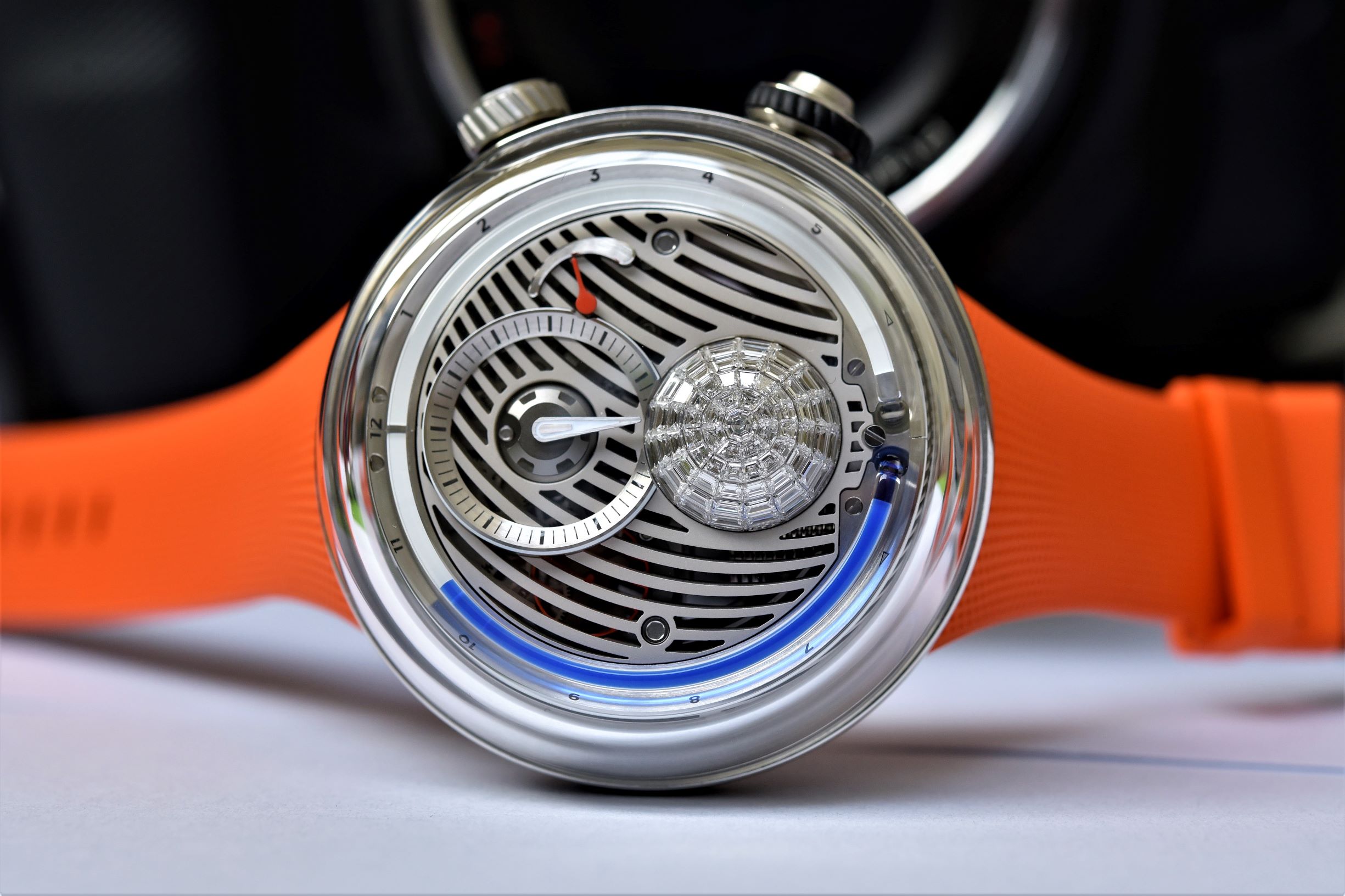 It is practical and even pretty fun to play with. But besides this prime utilitarian function, light is a defining part of the aesthetics and of the concept of the watch. Under the impressive sapphire crystal, fluids and electric light set the scene. The tri-dimensional metallic dial decor mimics light waves radiating from the lower crown while revealing part of the mechanism below. A ring of Superluminova underneath the capillary further enlightens the passage of time as it flows. The new HYT Flow comes in two variations. Uniting light-art and jewellery, the first one stages a dome made of 73 baguette diamonds creating surprising plays of reflections and refractions when illuminated. The second one is fitted with a tapered shape creating a never-ending vortex down to the mechanical movement.