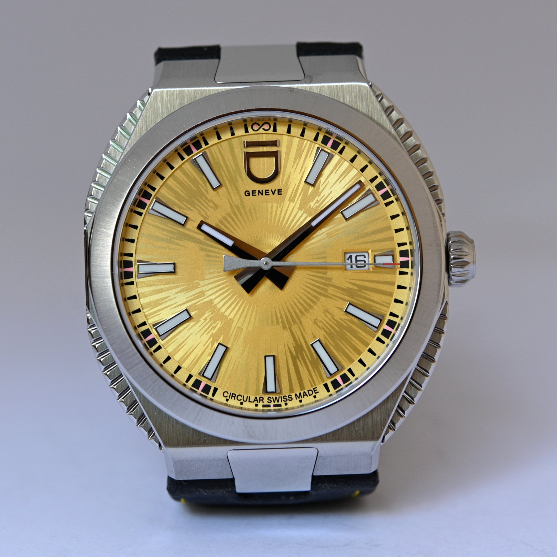 The ID Watch Circular S comes in a 41mm case with a modular construction, a round bezel, and distinct side decorations (that can be either brushed or fluted just like the watch we had for our shooting). It also doesn’t have traditional lugs and instead uses a single integrated link to fit the vegan strap. The case is made of 100% recycled 4441 stainless steel. The material is supplied by a company that has set up a waste collection network of 40 companies in the Swiss Jura. ID Watch (with the help of Quantis, a company based in EPFL Innovation Park) states that their material has 10 times less carbon footprint than standard steel.