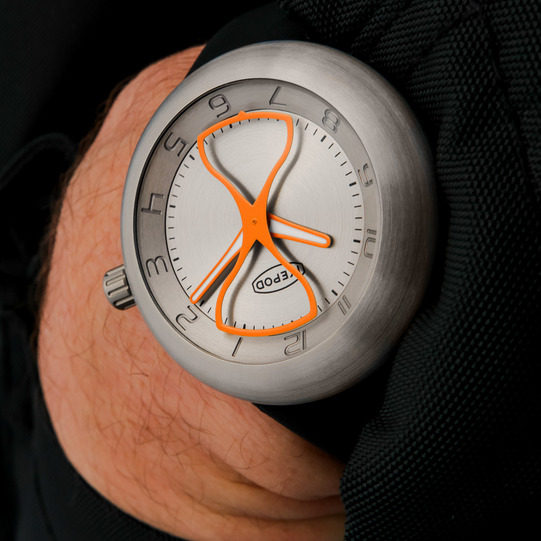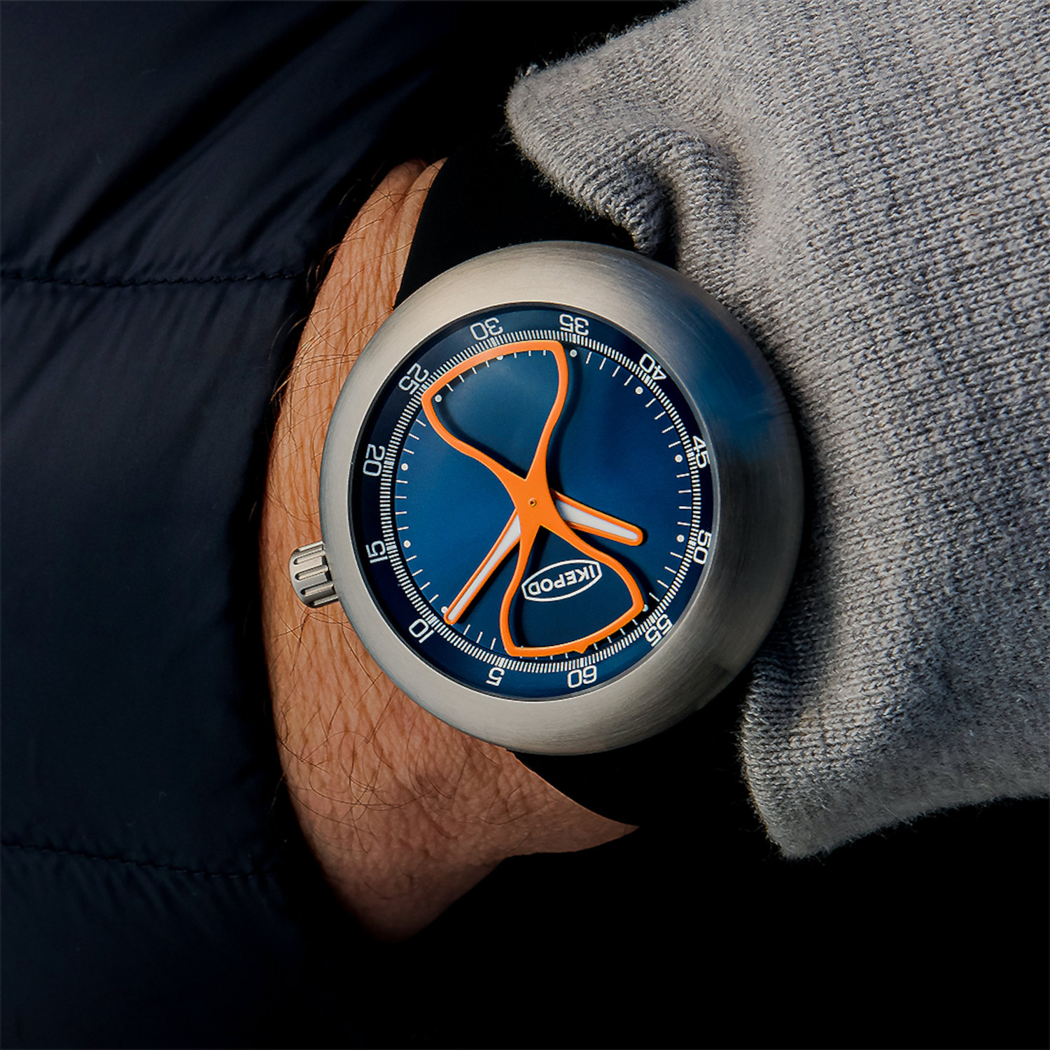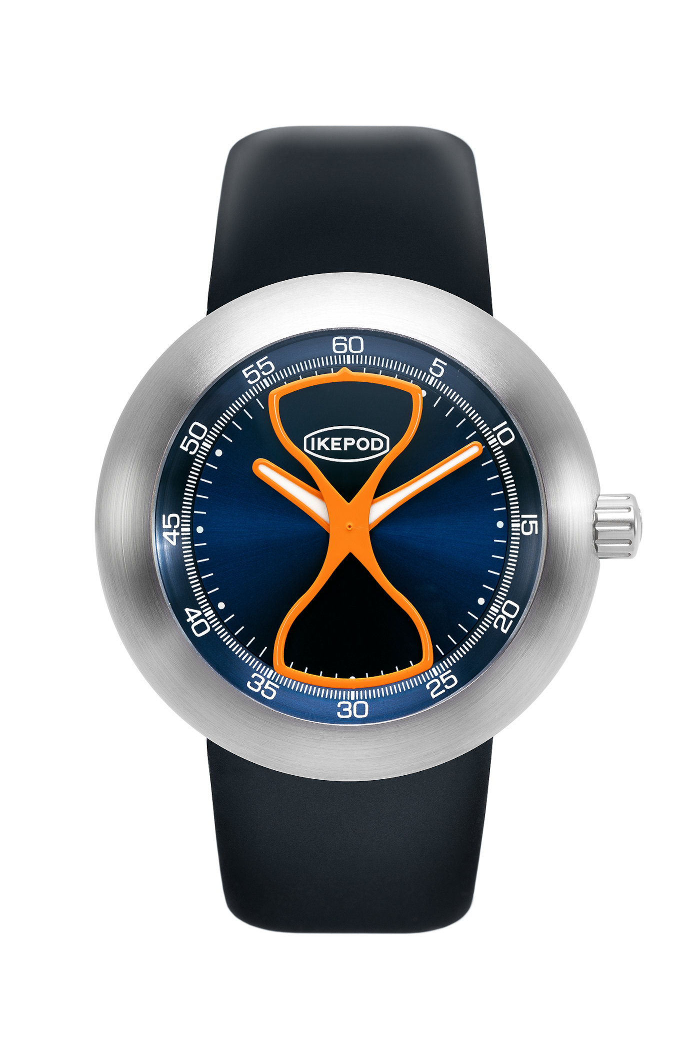 Col, recognizing Ikepod as a designer’s brand, collaborated with Emmanuel Gueit (famous creator of AP ROO) for the debut quartz-powered Duopod collection. The subsequent Megapod, a creation with Alexander Peraldi, former artistic director at Baume & Mercier, featured automatic Miyota calibres, followed by the Seapod, designed by Fabrice Gonet (Edge Design), and the Skypod series. The new Ikepod references promise quality and competitive pricing while remaining faithful to the brand’s DNA and the iconic pebble-shaped case aesthetic. With Ikepod turning 30 this year and sensing a moment for change, the brand announced that it would discontinue the 46mm Megapod series. As a parting gift to Ikepod enthusiasts, the brand now introduces a limited edition of Megapod, featuring a seconds hand shaped like an hourglass – an homage to the iconic Marc Newson Hourglass Ikepod creations.