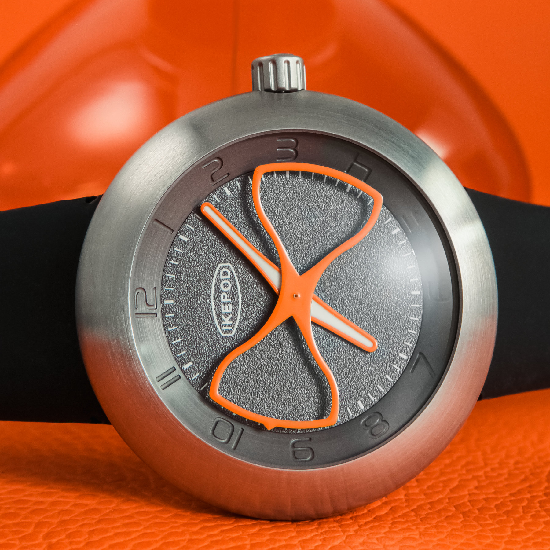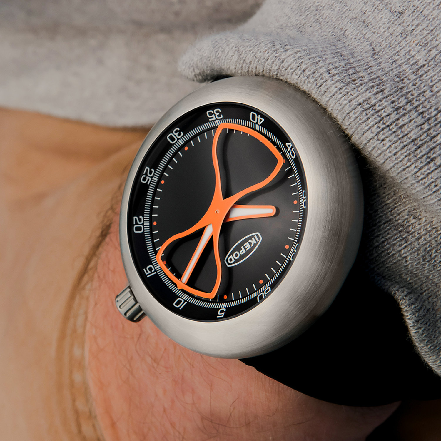 In this limited Megapod Hourglass series, comprising only 100 watches, a selection of seven dial designs will be offered, drawing inspiration from models featured in the collection over recent years. However, what distinguishes this limited series is the signature bright-orange central seconds hand in the shape of an hourglass. According to the brand, during the design of the Megapod dials in 2020, Alexander Peraldi conceived this feature as a tribute to the iconic object d’art associated with the Ikepod brand – a design no longer in production. The decision was made to preserve this element for a special series later. Another distinctive feature is more expansive hour and minute hands, outlined in orange and treated with Super-LumiNova, though the luminous treatment does not extend to the shaped second’s hand.