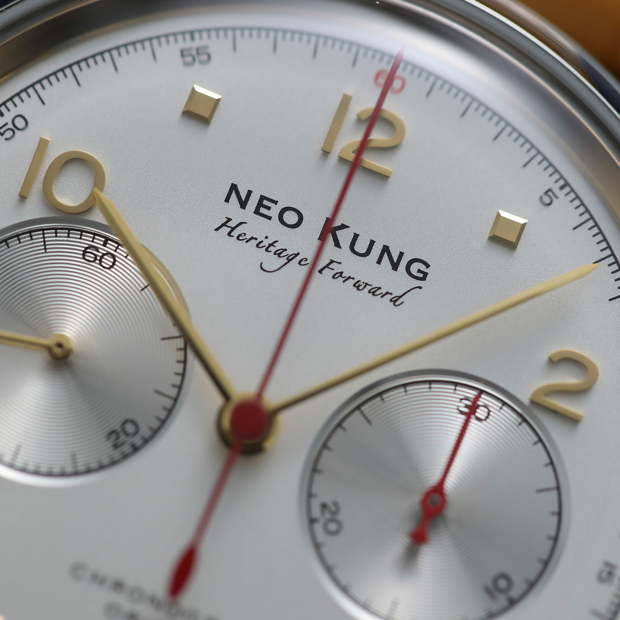 The dial for the Orienta is equal parts simple and charming. The silver finish, obtained by hand, gives it a very sleek look, especially combined with the hand-applied gold numerals and square markers. The bi-register layout for the small seconds and chronograph minutes is finished with a concentric grooved pattern. A gold ‘Shadow’ flange surrounds the entire dial, giving it a subtle dose of warmth. The gold hands for the hours, minutes and small seconds are offset with bright red lacquered hands for the chronograph. The dial is signed by its maker, and the line “Heritage Forward” is a nod to Neo Kung’s inspiration and background in watchmaking.
