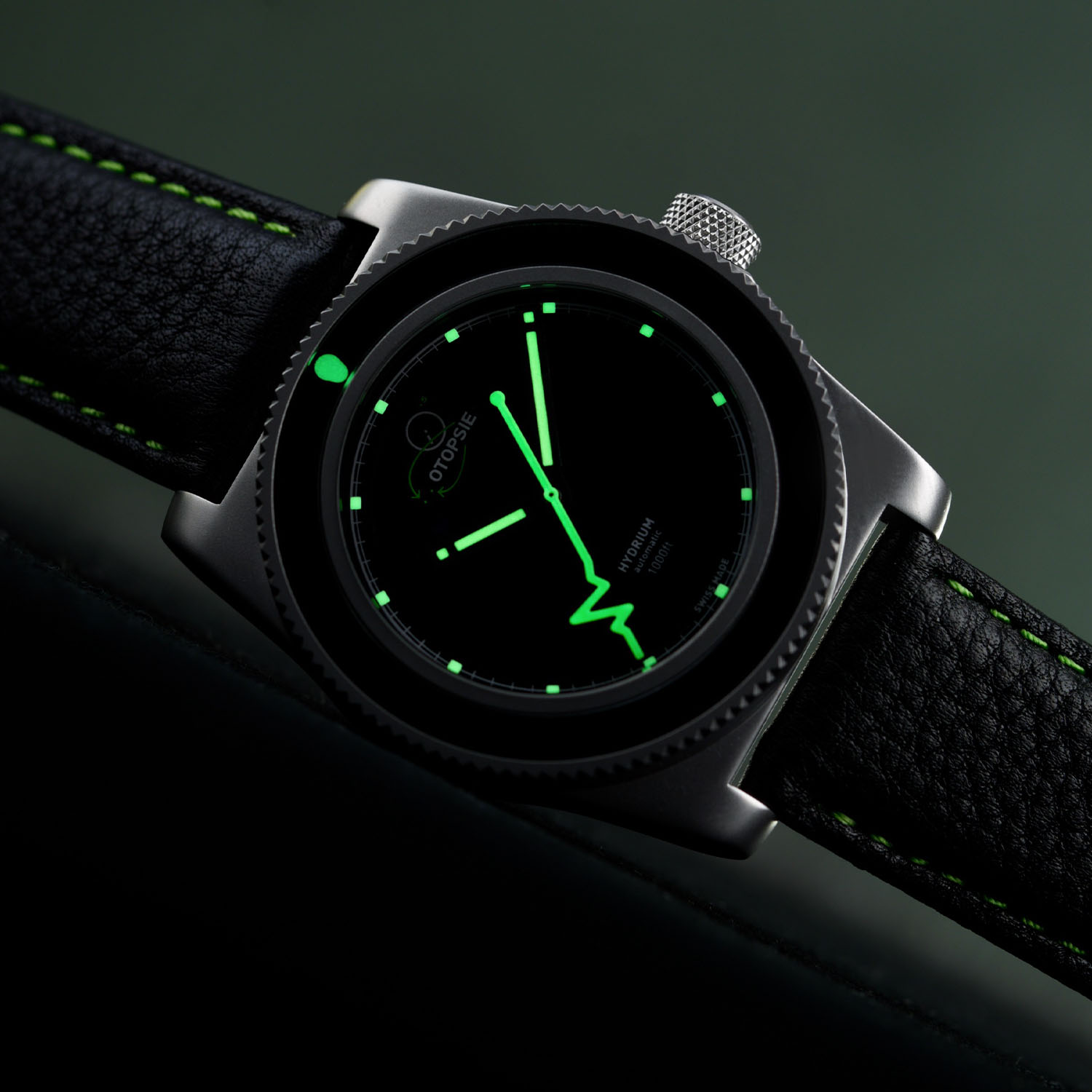The dial of the Hydrium Seconde/Seconde/is the USP. The black matte surface with the white railroad track-style minute chapter ring and little Super-LumiNova squares for hour markers is a perfect stage for the drama-infused spectacle. The old Isotope logo now reads Otopsie (autopsy), with tiny green arrows indicating where the I and S have been positioned before Isotope decided to let it rest forever; note the Failing Heartbeat second hand. Hopefully, doctors or nurses within the NHS will not take advantage of the opportunity to own the Hydrium Seconde/Seconde/ for fear of becoming seriously misunderstood.
