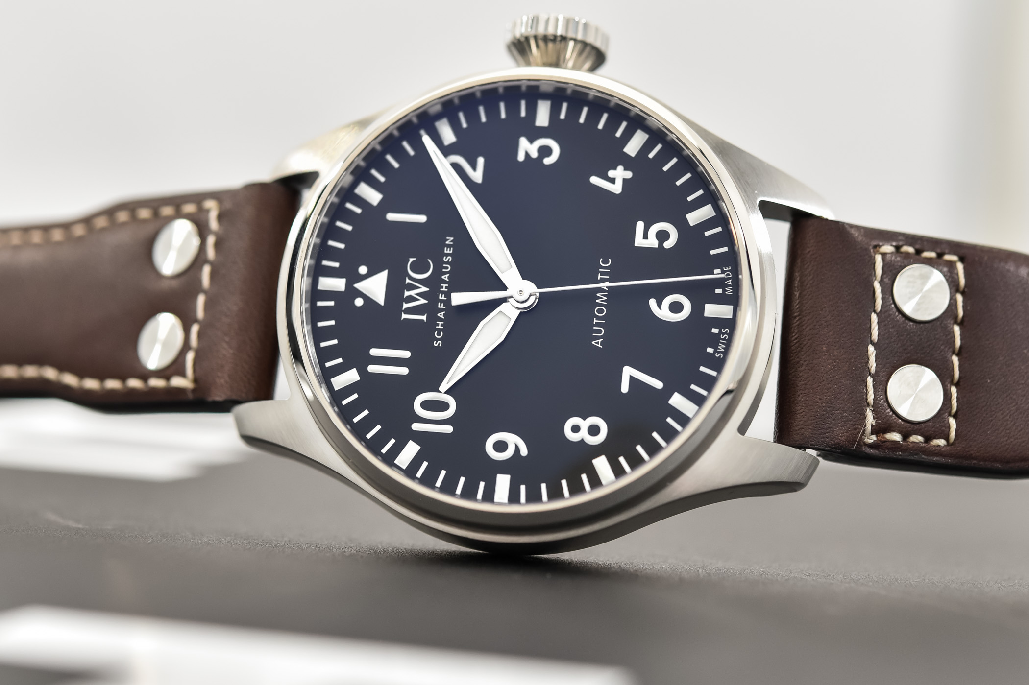 So what do we have with the IWC Big Pilot’s Watch 43? Basically, and as you’ve guessed by the name, it’s a 43mm model with IWC’s typical pilot’s design, with a slimmer profile (13.6mm) and a somewhat more wearable shape – well, with a 53mm L2L measurement, it isn’t a small watch, but it’s smaller than the BP46. The case is brushed steel with polished accents, the crown has an oversized diamond shape, and the glass is secured against drops in pressure, but now, there’s a screw-in crown and a 100m water-resistance. Versatility, all around.