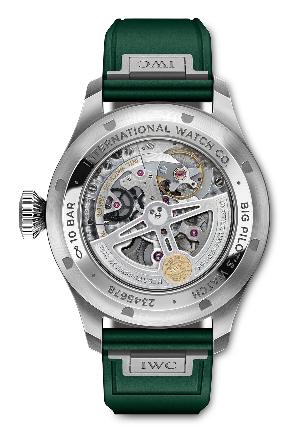 As for the dial, the Big Pilot’s Watch 43 is the most focused model you can imagine. It’s a time-only watch, with three central hands, and that’s it: no date, no power reserve, just large Arabic numerals and markers, and pilot’s hands filled with SLN. At first, and excluding the special editions (Spitfire and Top Gun), the BP43 was launched in matte black and sunray-brushed blue. And it’s now joined by the new reference IW329306, with a deep green, sunray-brushed dial named “Racing Green” – a hue used to paint British racing cars since 1903. Here it’s combined with pure-white printings and rhodium-plated hands, all being luminous, of course.