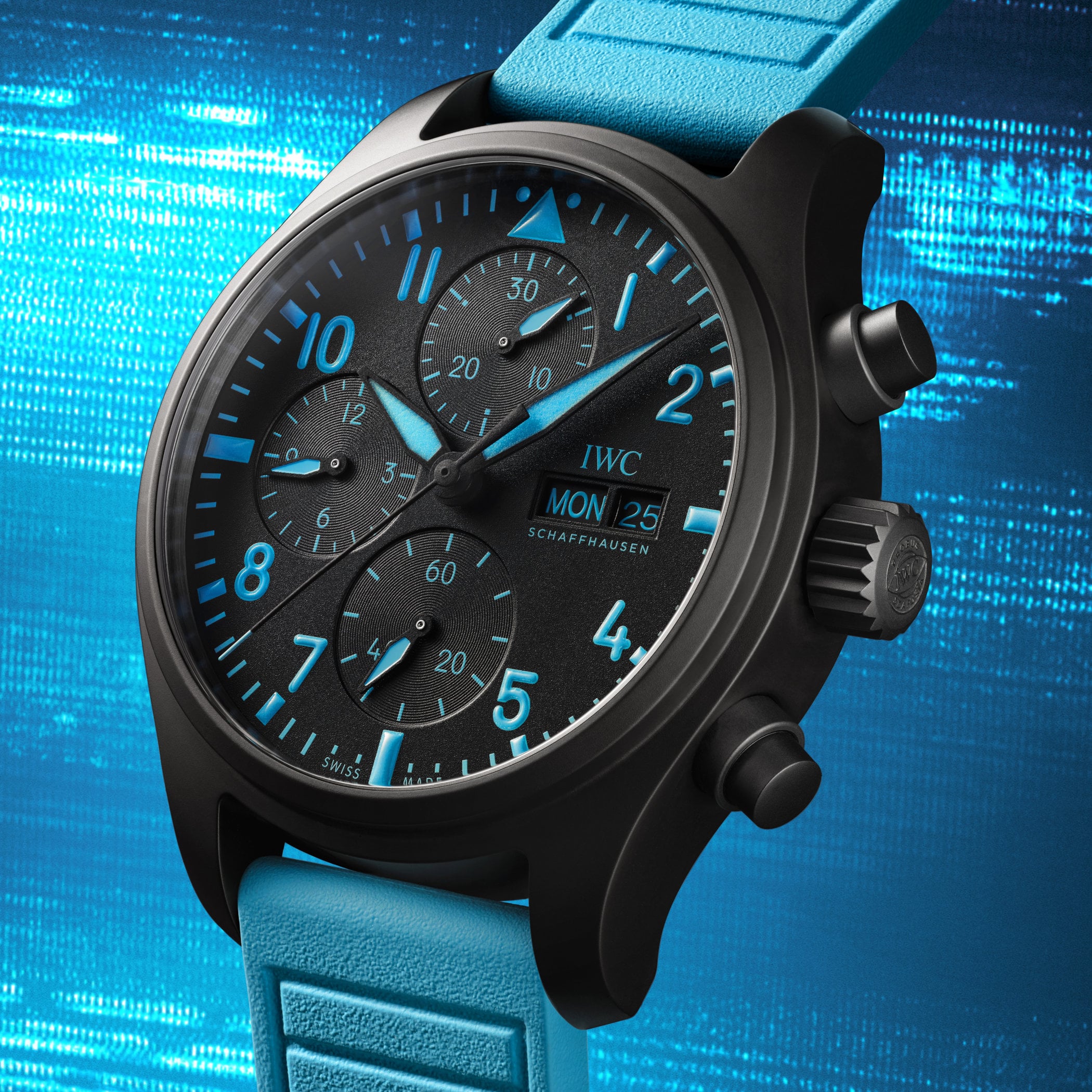 British driver George Russell, currently racing for Mercedes-AMG Petronas Formula One Team, joined IWC’s paddock of ambassadors in 2022. Exchanging the steering wheel of his F1 for the design board, Russell worked alongside IWC’s creative team to design the new limited edition Pilot’s Watches, emblazoned with the F1 pilot’s signature blue colour featured on his helmet. The new chronograph and time-and-date editions are from IWC’s Top Gun family, renowned for its tactical, contemporary military-style watches. Presented in black ceramic cases with blue accents, both models are limited editions of 1,063 pieces.