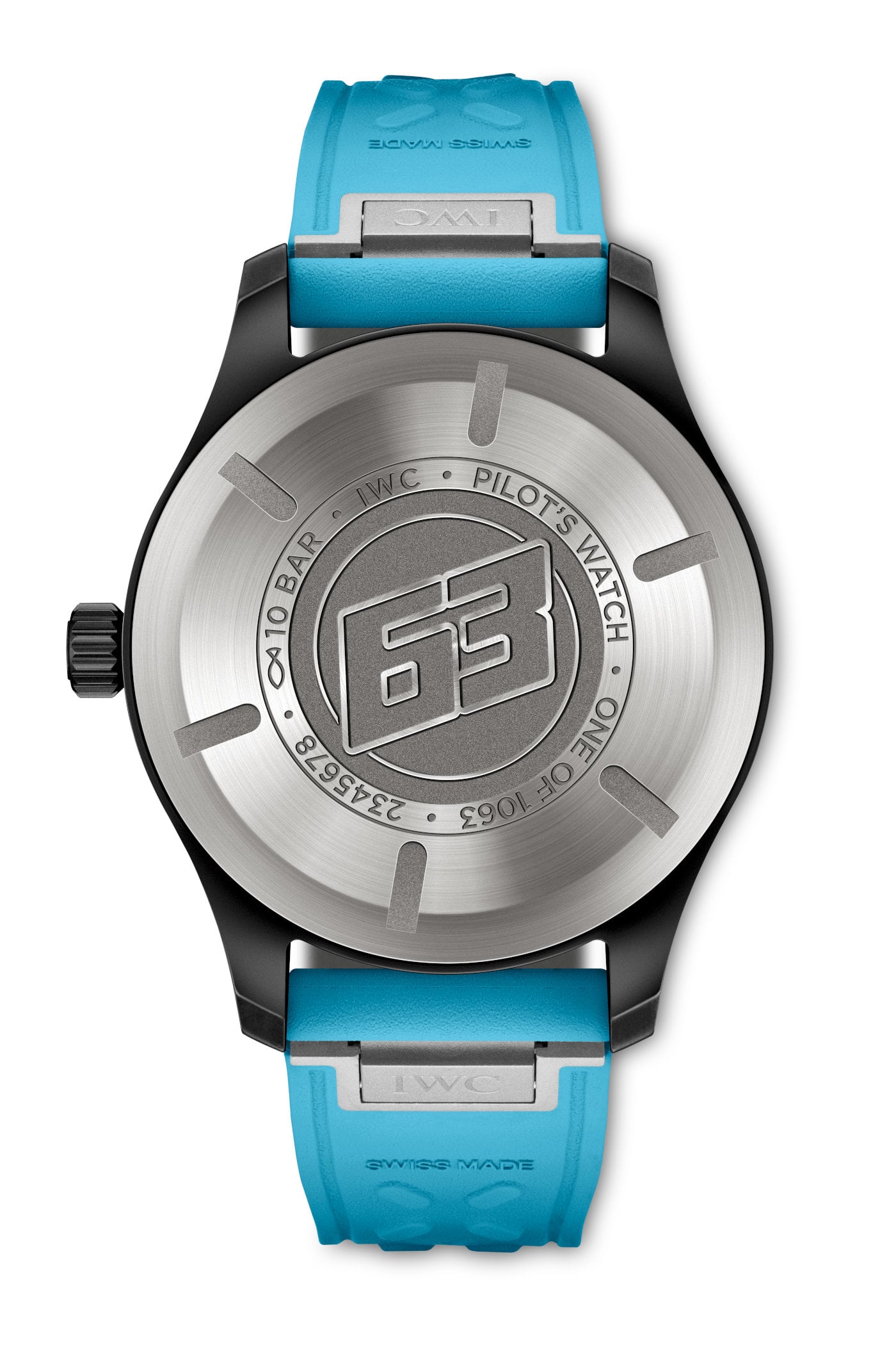 Bringing a touch of Russell’s talismanic blue racetrack helmet to the wrist, the watches feature bold blue contrasts on the dial and strap. Another detail closely associated with Russell is the number 63, apparently the first number his older brother Benjy used on his kart in the 2000s, which became the “family racing number” and is now featured on his matte blue helmet.