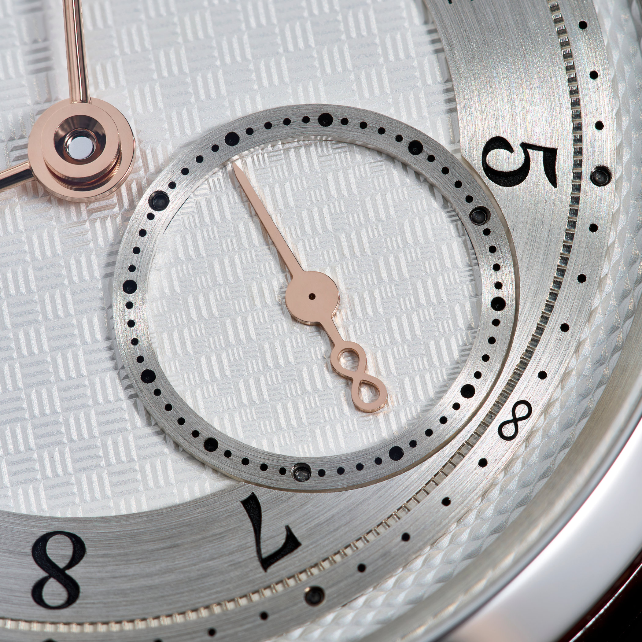 The highlight of the Infinity Series Pure is Shapiro’s guilloché mastery. The dial is engine-turned by hand using antique rose engines and straight-line machines to produce the Infinity Weave, a basket weave within a basket weave. Two dial configurations are available: a blackened zirconium version with polished white gold hands and a frosted silver dial with rose gold hands. Both dials boast engraved circular brushed chapter rings and minute tracks.